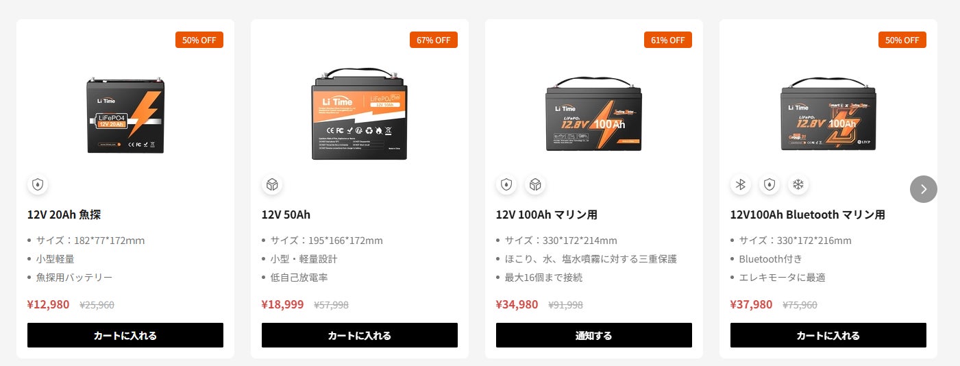 今回の感謝祭では、LiTimeの主力製品である 12V/24V/48Vリン酸鉄リチウムイオンバッテリー(LiFePO4 バッテリー) をはじめ、充電器やインバーター、モニターなどのシステム関連アクセサリーも特別価格でご提供します。