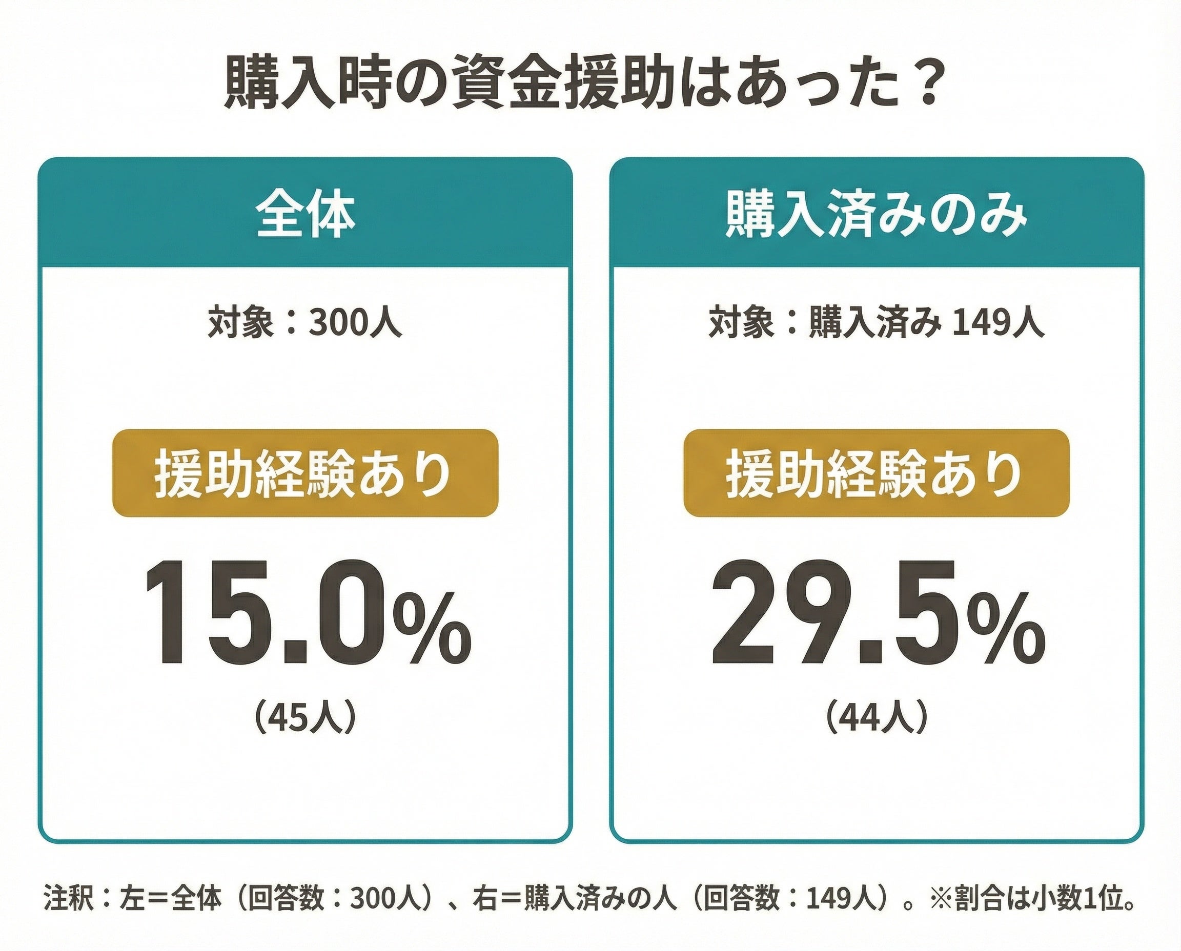 購入済みの人149人に絞ると、援助経験がある人は29.5%(44人)となり、購入のタイミングで援助が発生しやすい実態が見えてきます。