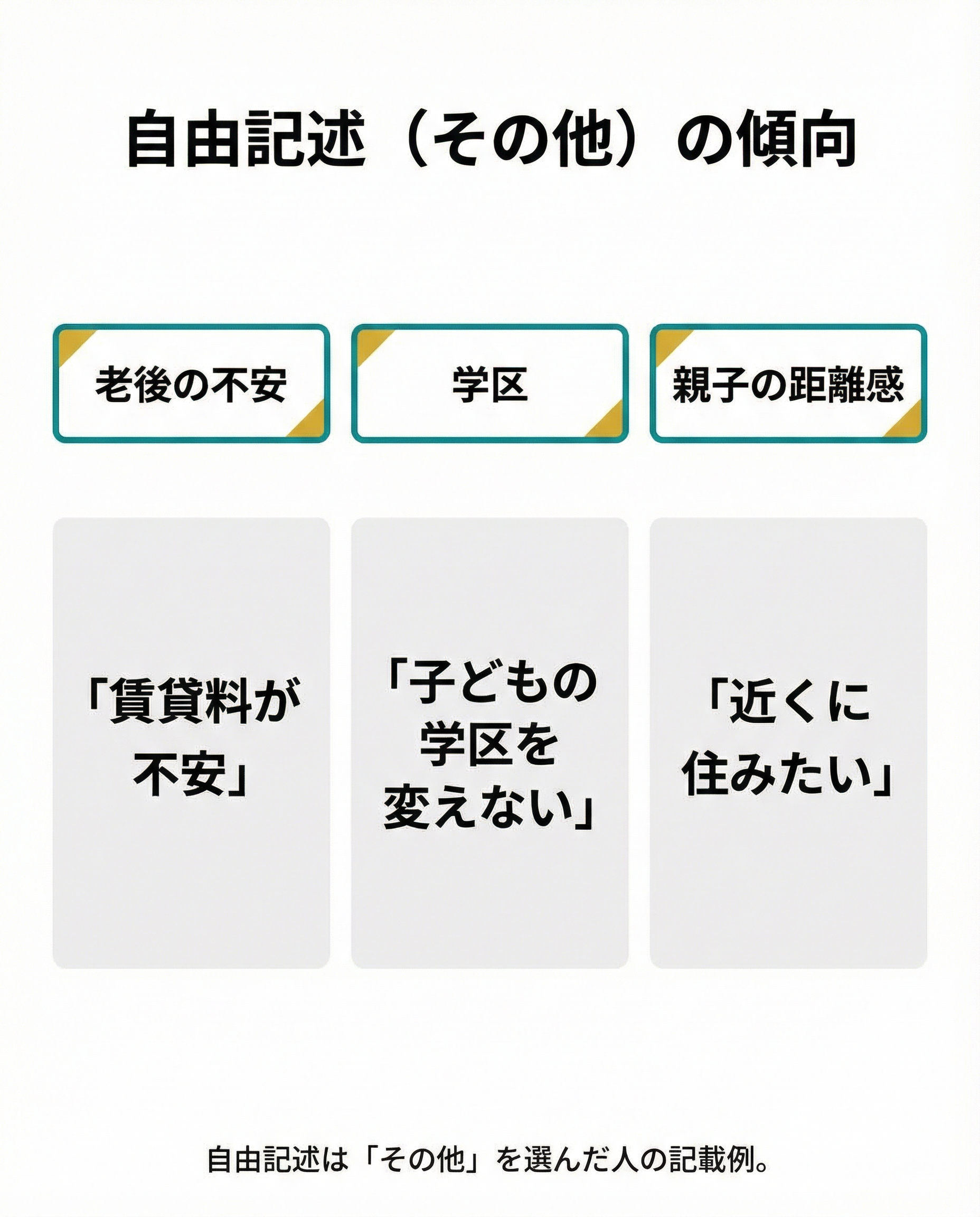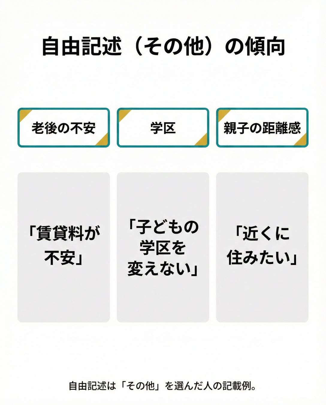 また、自由記述の内容は、人生の節目や家族構成の変化といったタイミングが購入検討に影響している可能性も示しています。数字には表れにくい個別事情が、最終的な意思決定の後押しとなっている様子が見て取れます。