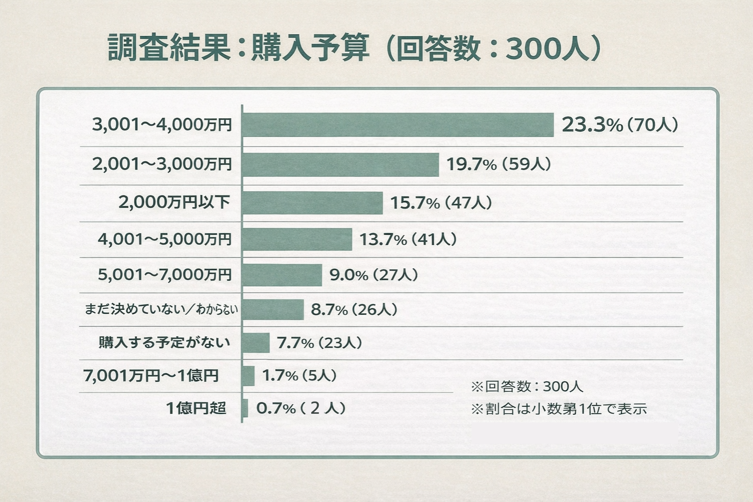 ・購入予算は3,001〜4,000万円が最多で23.3%(70人)