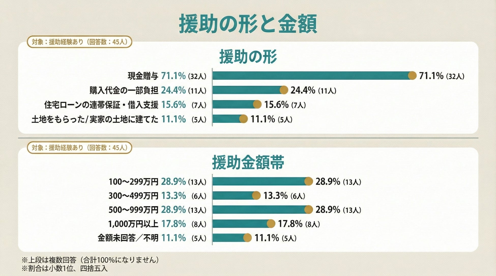 援助経験がある45人に援助の形(複数回答)を聞くと、最多は現金贈与71.1%(32人)でした。