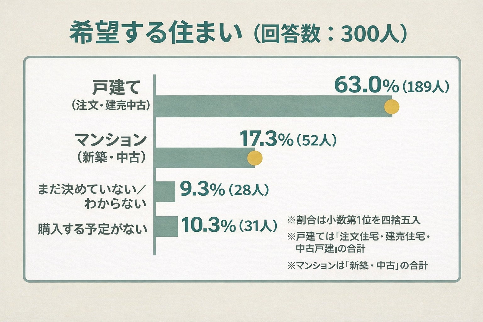 戸建て(注文住宅・建売住宅・中古戸建)の合計が63.0%(189人)で最多となりました。