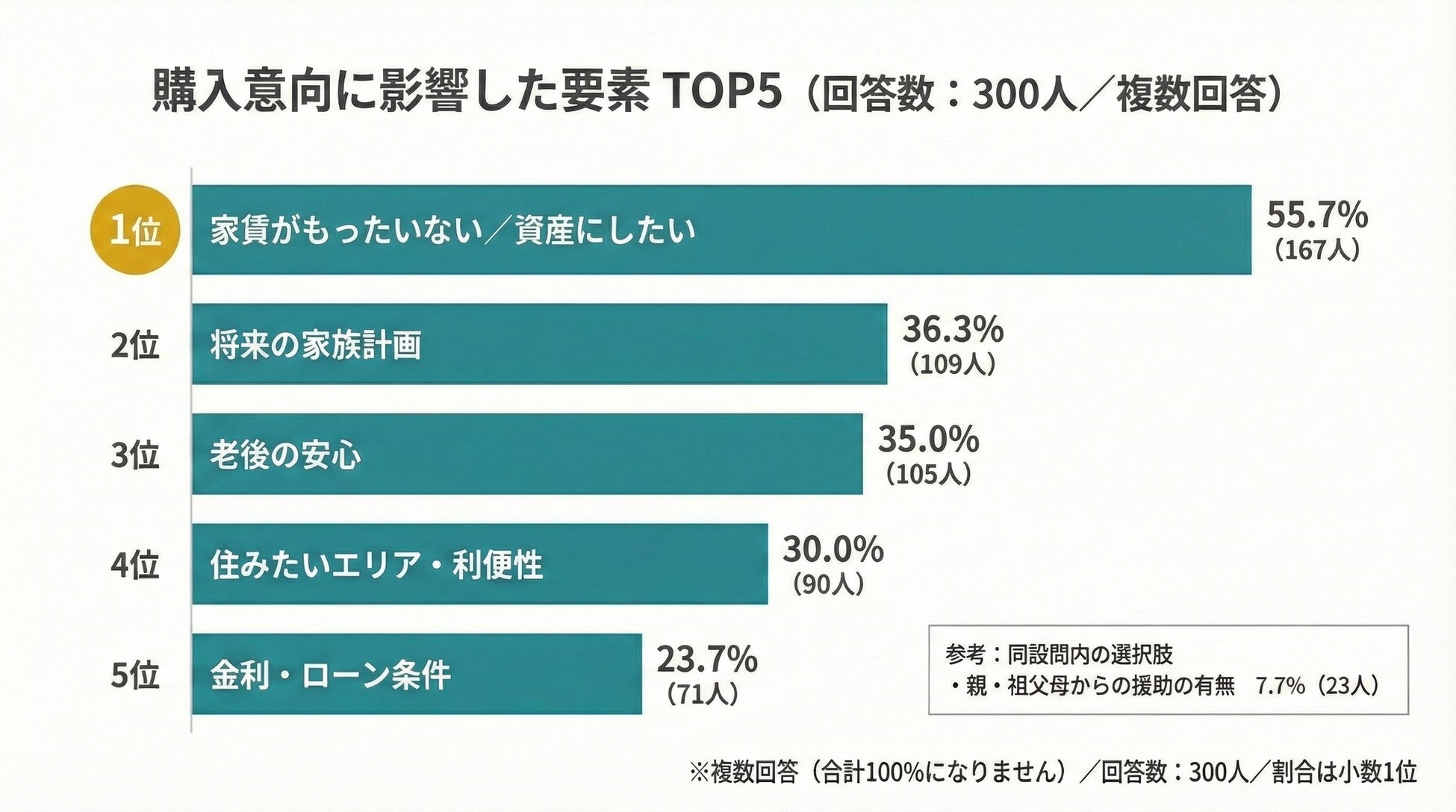 マイホーム購入300人調査:購入の後押しは家賃がもったいない/資産にしたい55.7%(167人)――援助経験は15.0%(45人)