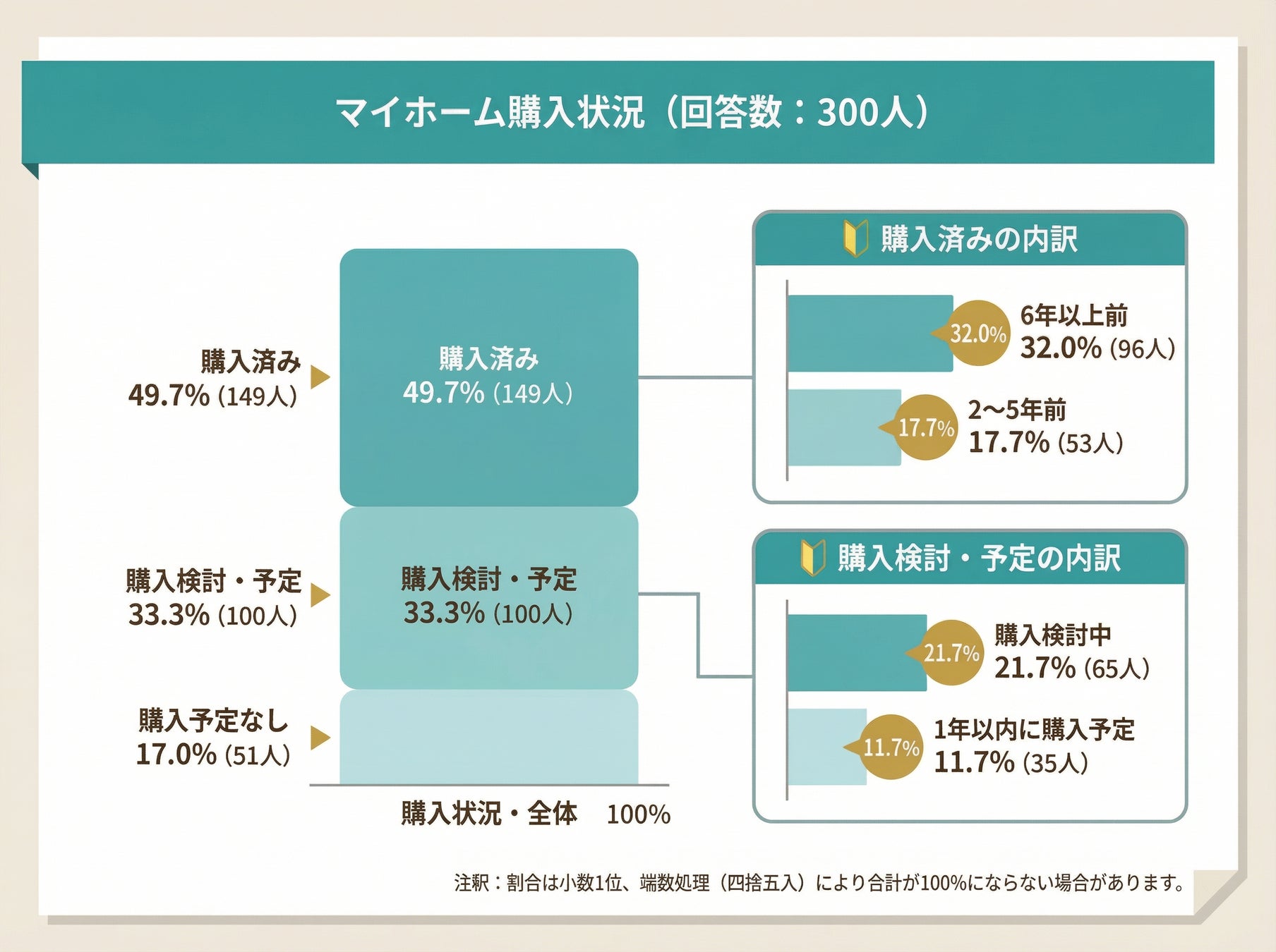 現在のマイホーム購入状況を見ると、購入済みが49.7%(149人)でした。