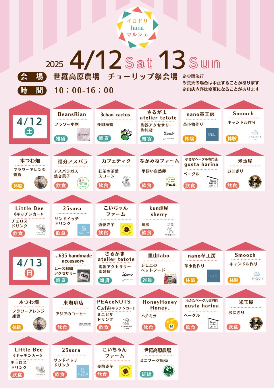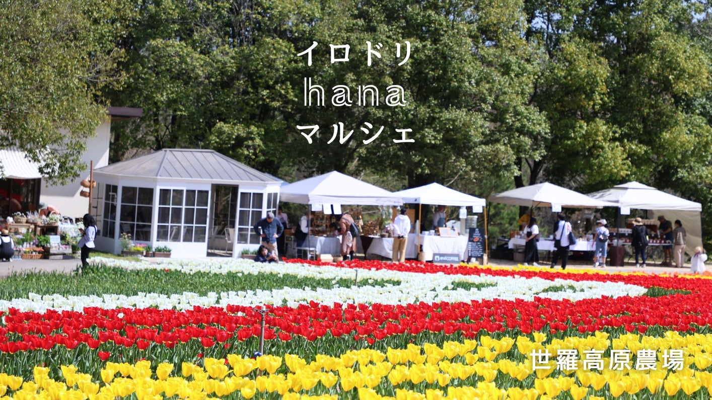 世羅高原農場では、2024年に初開催し好評の「イロドリhanaマルシェ」を2025年も開催します。チューリップが咲き広がる園内に、世羅町や県内、近県のステキなものが大集合します。花と一緒にお買い物をお楽しみください。