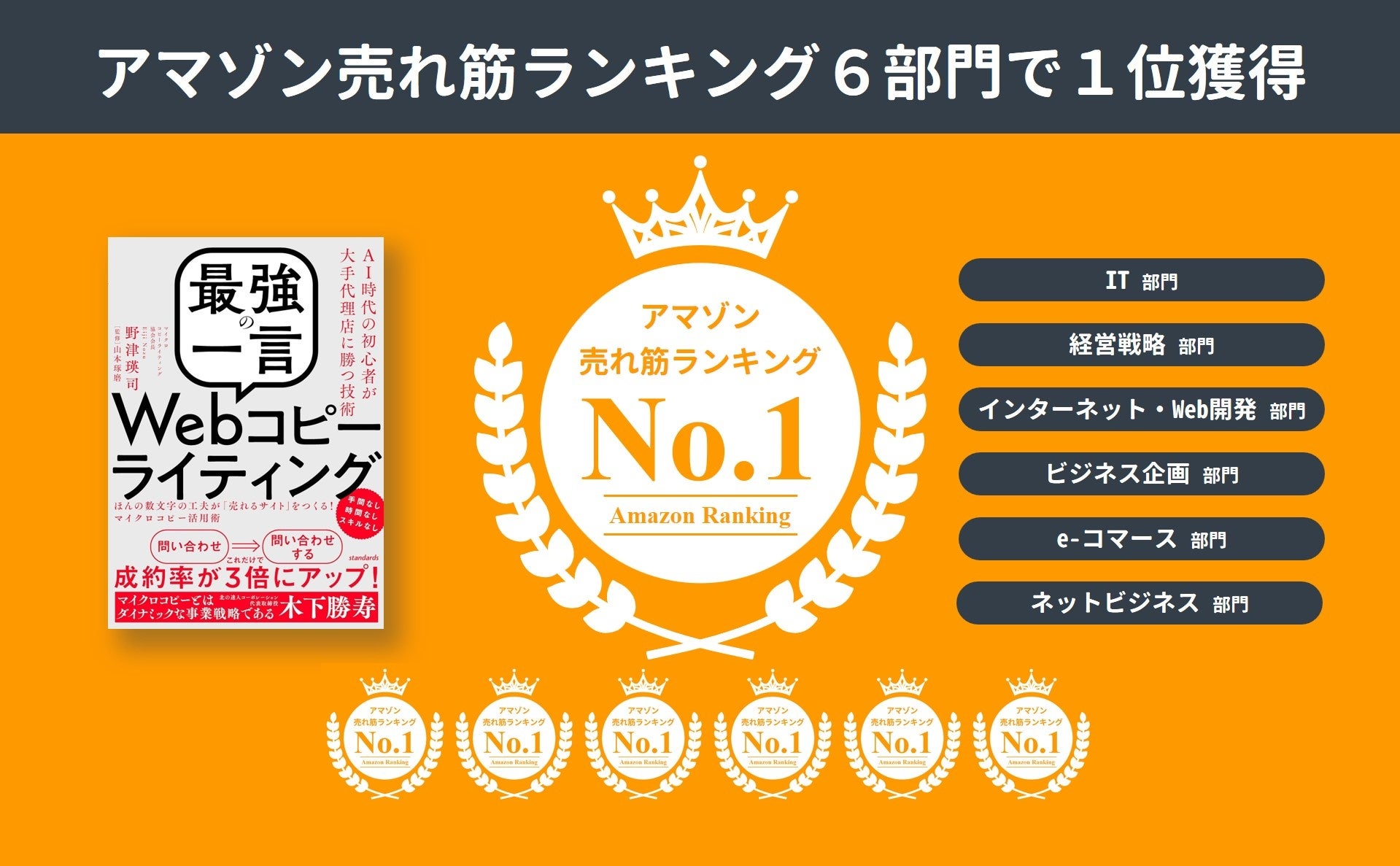 Webコピーの最強技術を解説する本書が、Amazon売れ筋ランキング6部門(IT/経営戦略/インターネット・Web開発/ビジネス企画/e-コマース/ネットビジネス)にて第1位を獲得致しました。