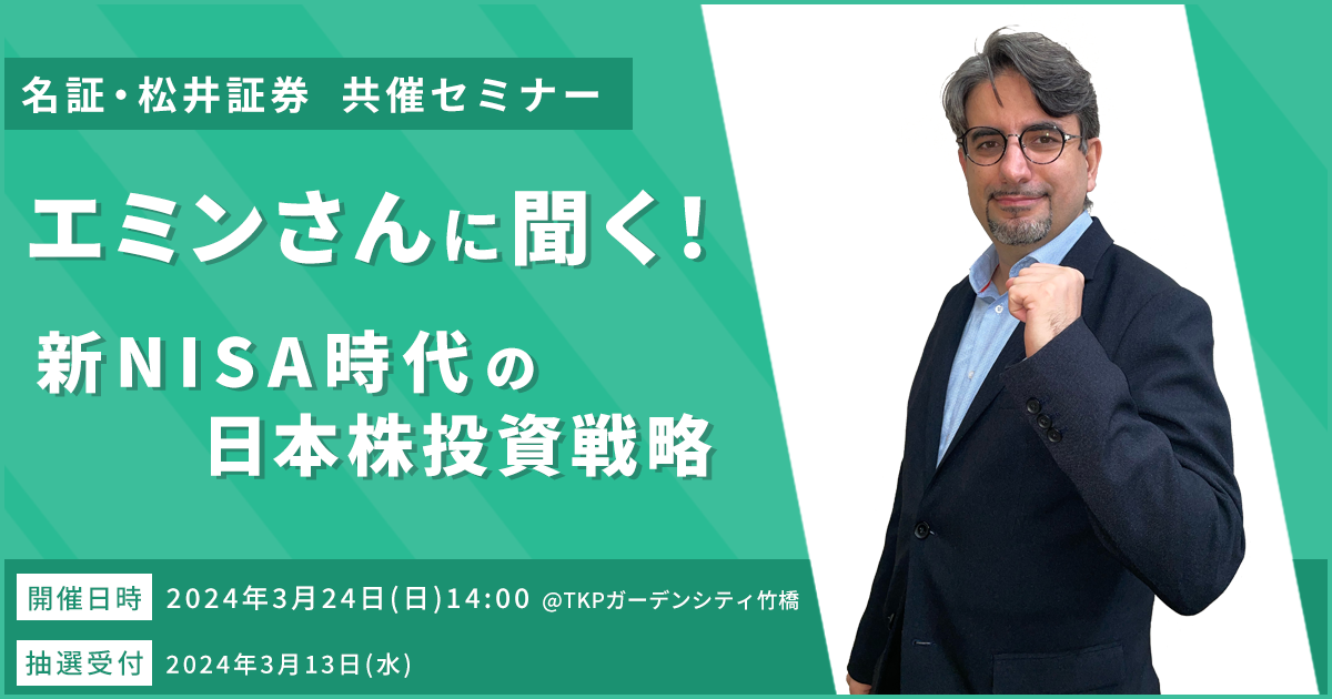 本セミナーでは、人気エコノミストのエミン・ユルマズ氏にご登壇いただき、日本株投資のポイントや今後の見通し、銘柄選びのコツなど、詳しくお話いただきます。「新NISAをきっかけにこれから日本株投資を検討している方」や、「日本株投資を始めたけど、なかなかコツがわからない」という方にお勧めのセミナーです。