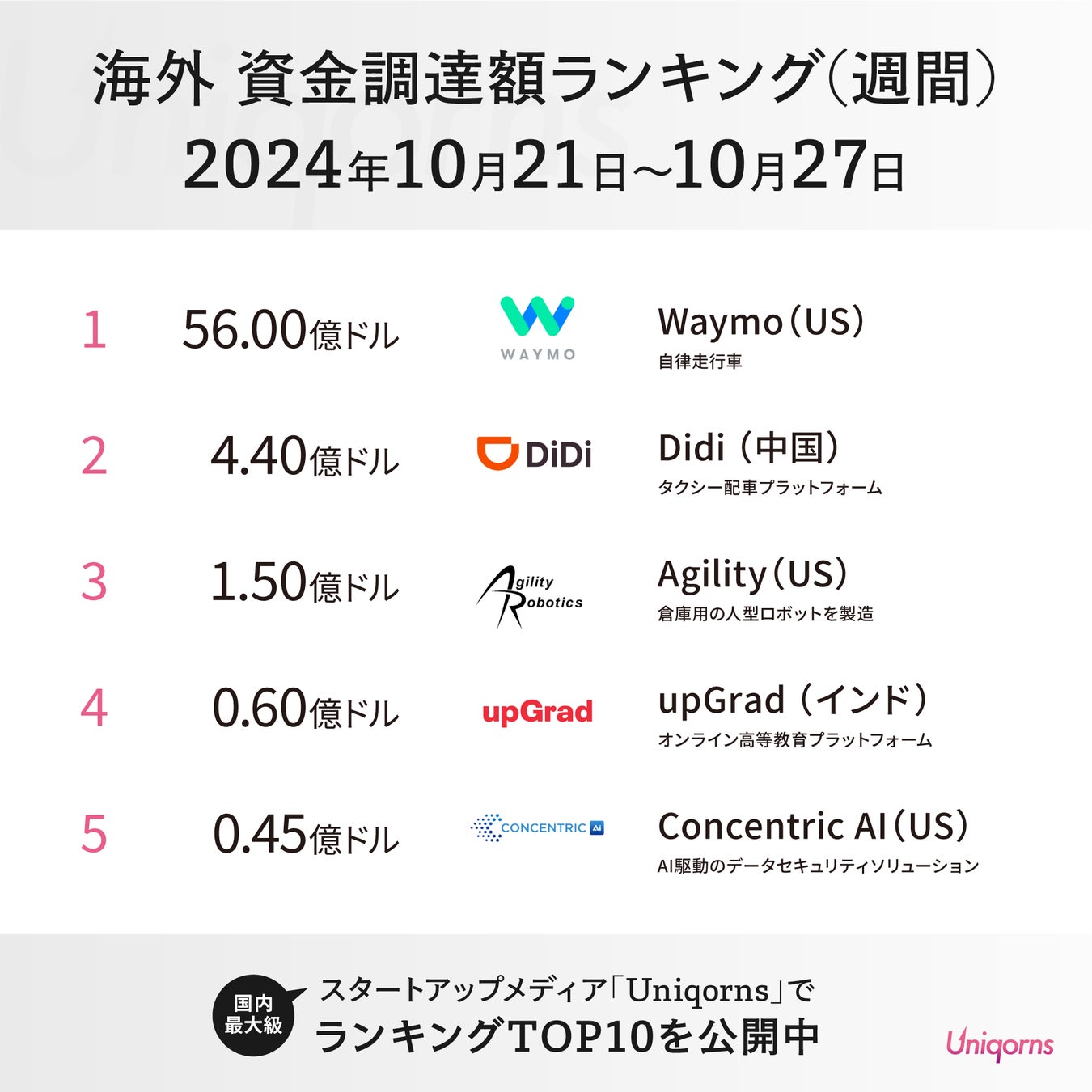 国内最大級のスタートアップメディア「Uniqorns(ユニコーンズ)」(運営:株式会社エモリューションクリエイティブ 本社:福岡市、代表取締役:松石 圭介)が発表した今週の海外スタートアップ資金調達ランキングでは、Googleの親会社アルファベットなどから総額56億ドルという巨額の資金を調達した自律走行車開発のWaymoが首位を獲得。2位には中国の配車プラットフォーム大手のDidiが4.4億ドルを調達し、3位には倉庫作業用の人型ロボットを開発するAgility社が1.5億ドルを調達するなど、モビリティやロボティクス分野での大型調達が目立つ結果となりました。