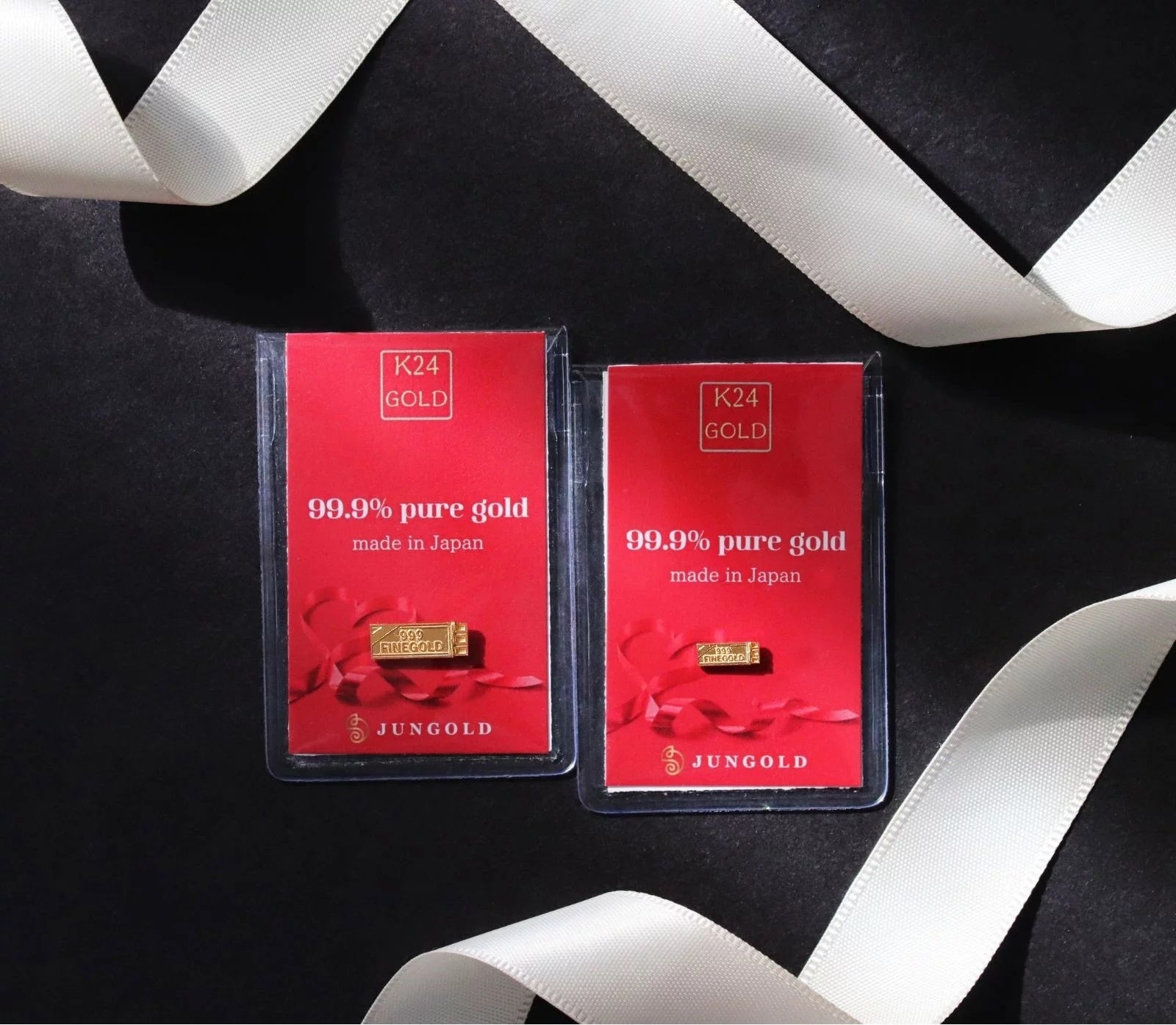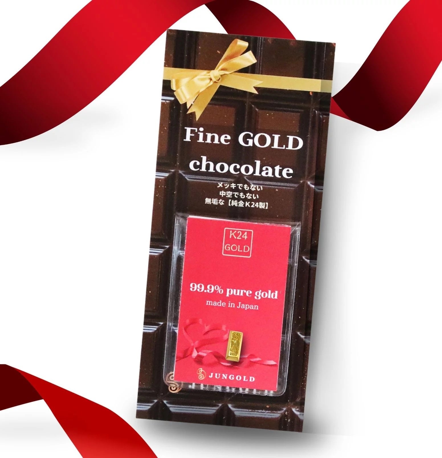 ミニチュアの純金のチョコレートは、お財布やスマホケース等に入れられる、コンパクトなビニールケース入り。可愛くって資産としての価値もある特別な贈り物になるでしょう。