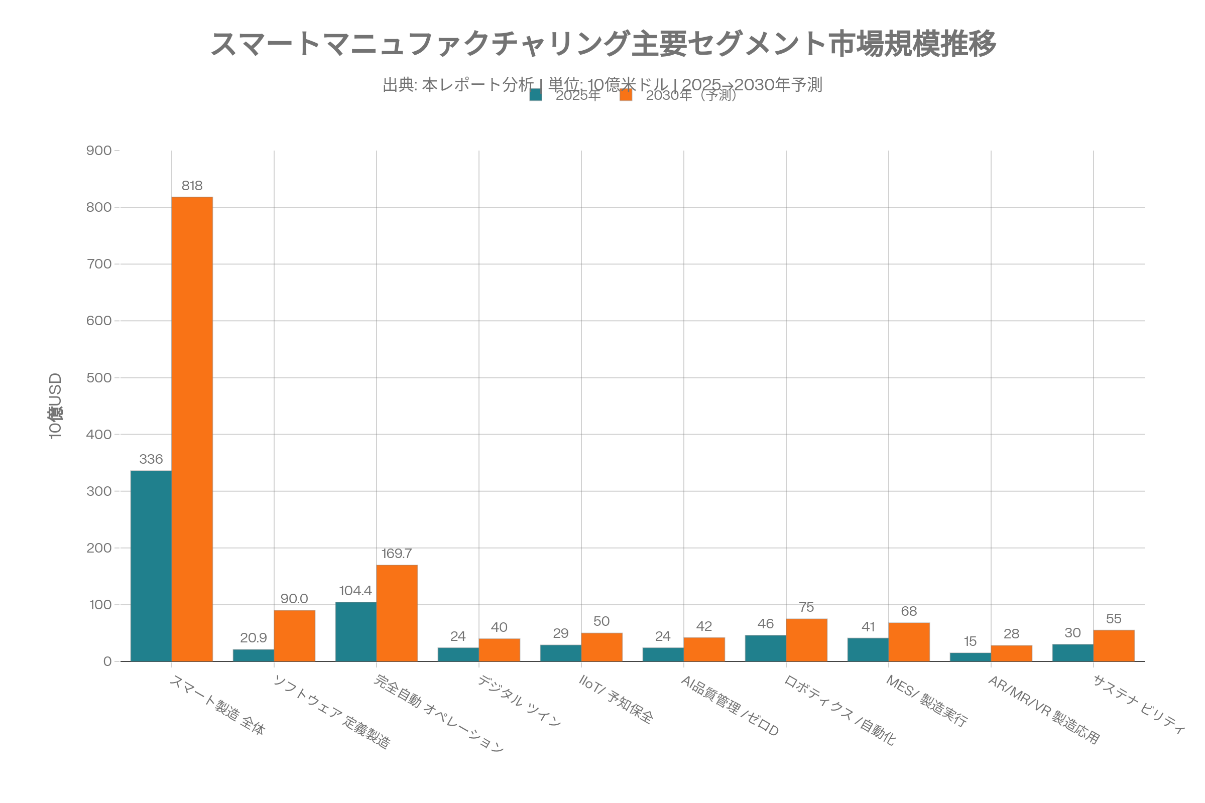 PLCベースの制御から「ソフトウェア定義製造(SDM)」へのパラダイムシフトが加速しており、2023年時点の336億ドル市場が2030年に818億ドル超へ拡大する見通しである。Manufacturing OS、Factory-as-Code、OTAアップデートといった新概念が工場のアーキテクチャを根本から書き換える。