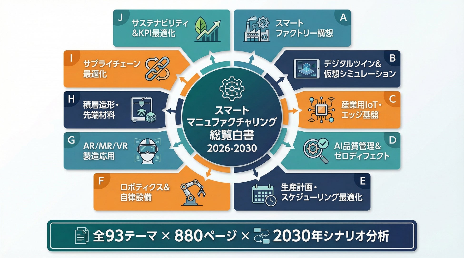 本白書は、スマートマニュファクチャリングおよび製造自律化領域を 全93テーマ・約880ページ にわたり体系的に分析した、2026年版の産業フォーサイトレポートである。