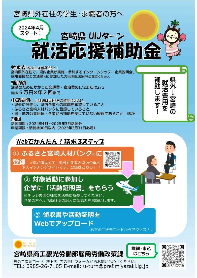 宮崎県では、宮崎県内企業へのUIJターン就職・転職を促進するため、宮崎県外在住者を対象に就職活動等にかかった交通費・宿泊費の一部を補助する「宮崎県UIJターン就活応援補助金」を新たに創設し、2024年5月から申請受付を開始しました。