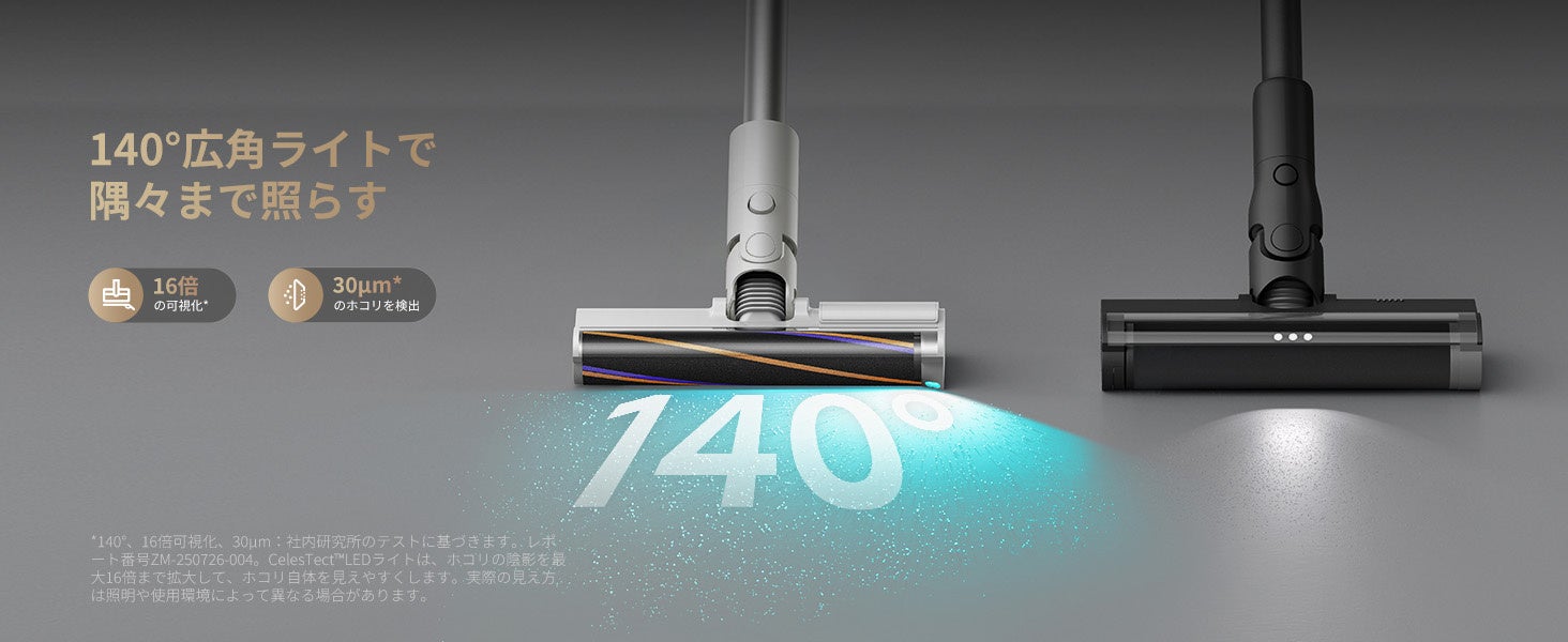CelesTect™ LEDライトを搭載し、ベッド下やソファ下など暗所のホコリも見逃しません、暗い場所を照らす統合された 140° CelesTect LED ライトも備えており、ほこりの視認性を最大 16 倍向上させます。[注5]。