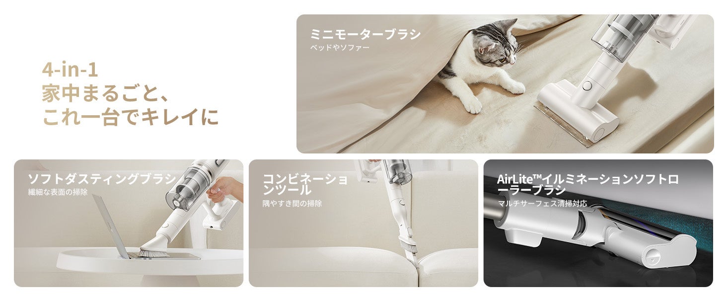 コンビネーションツール、ソフトダスティングブラシ、ソフトローラーブラシ、ミニモーターブラシの4種類を付属。床から高所・細部まで対応します。