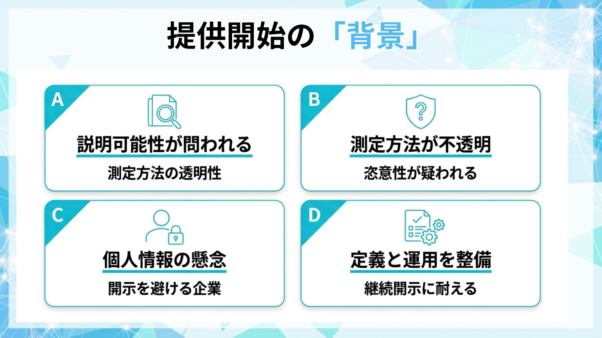 指標の"開示"は、取り組みそのものだけでなく、設計と運用の透明性を示せるため差別化になりやすい一方、定義が曖昧だと比較可能性や説明責任が崩れます。本支援は、指標を経営指標へ接続し、IR・採用・入札等で説明可能な状態を構築します。