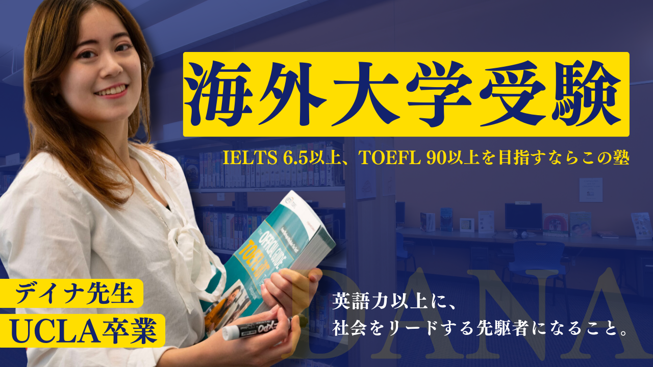 本コースを開設するにあたって提携したDana先生は、カリフォルニア大学ロサンゼルス校(UCLA)を 卒業しており、TOEFLやIELTSの英語レッスンで多くの生徒のスコアアップをサポートしている他、イギ リスのマンチェスター大学など海外の有名大学に合格者を輩出しており、海外大学の受験に特化した受験のプロです。