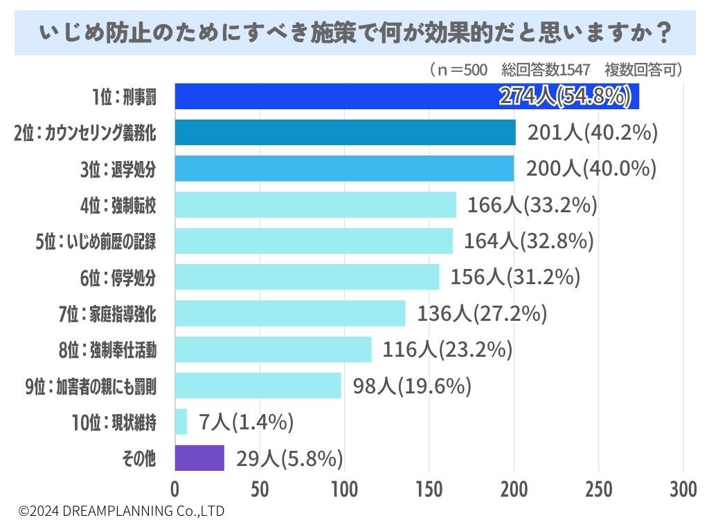 ★ 1位:刑事罰の厳格化:いじめ加害者に対して、厳しい刑事罰を課すべきだ 274/500名(54.8%) ★