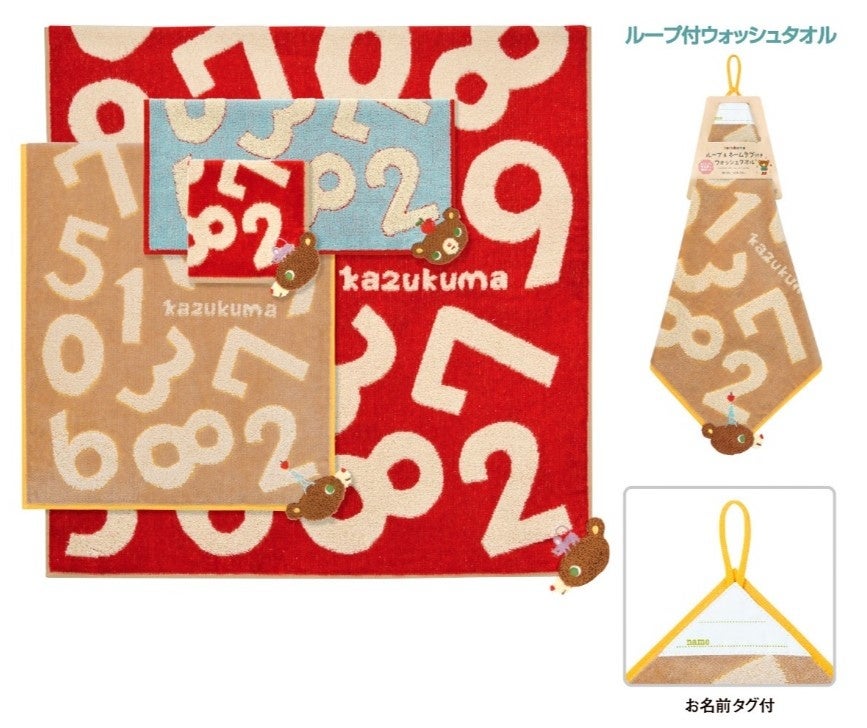 「かずくま」はイラストレーター カワツナツコさんのオリジナルキャラクターです。文字の読めない幼児でも楽しめるカラフルな絵本から生まれたキャラクターの「かずくま」が、今回入園・進級にぴったりなお手拭きタオルになりました。3種類合計8パターンある“かずくまタオル”は、思わずお子様が進んで手を洗い拭きたくなるようなカラフルでかわいらしいタオルです。発売されて間もないため、他のお友達とかぶる心配も少ないです。タオルはループ(フック掛け)付きで、縫い付ける必要がなく、名前を記入できるタグもあるのですぐに使えます。生地はふかふかでやわらかく、34センチ四方と大きめだから、しっかりと拭くことができます。プレゼントにもおすすめのアイテムです。