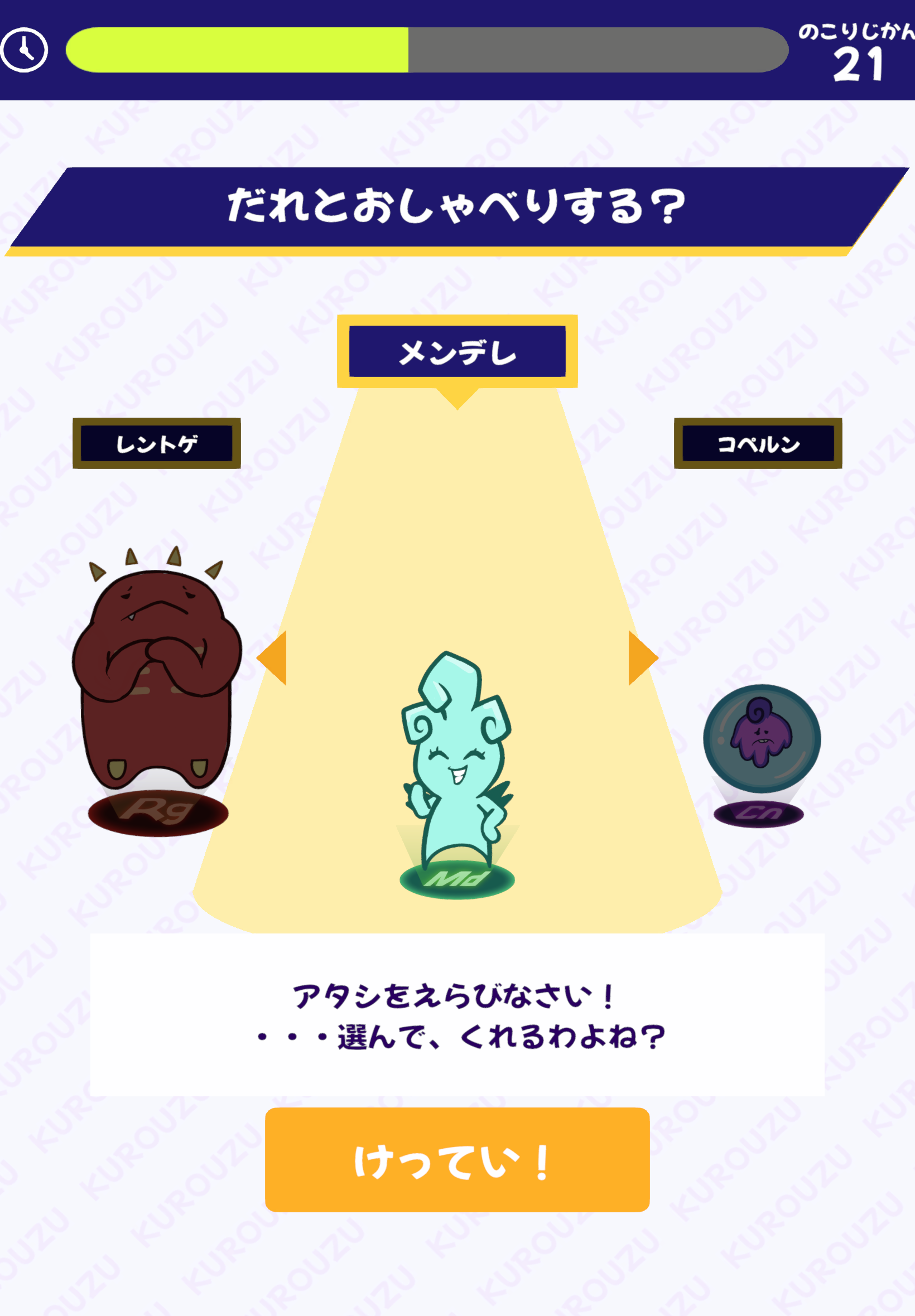 3体の個性豊かな「EMO-エモ-(AIキャラクター)」の「メンデレ」「レントゲ」「コペルン」の中から、話し相手を選びます。それぞれが異なるデザインや声、性格、口調を持っています。