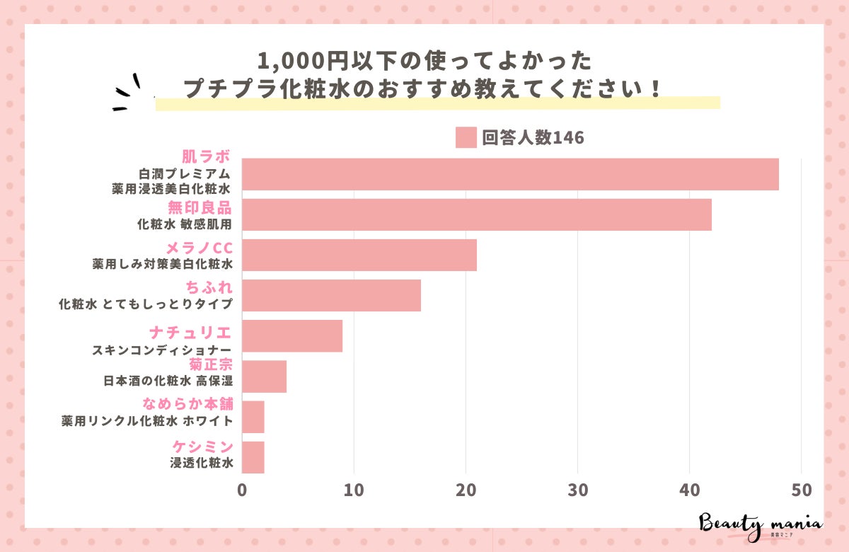 「1,000円以下で買えるプチプラ化粧水のおすすめ教えてください」というテーマで146人にアンケートを行ったところ、「肌ラボ 白潤プレミアム」と回答したのは全体の32.8%、次ぐ「無印良品 化粧水 敏感肌用」は全体の28.7%でした。