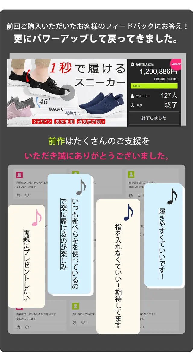 『1秒で履ける靴!かがまず足を入れるだけでキレイに履ける靴。ソールが大幅強化』がMakuakeにて先行販売スタート、開始当日に目標達成しました!