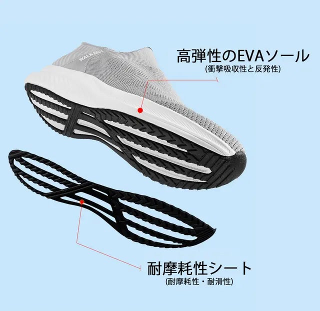 ソール(靴底)には、高弾性EVAを採用しました。EVAは運動靴ソールによく使用される柔らかい素材ですが、更に高弾性のEVAを採用することで体重をしっかり支えて1日中履いても疲れにくいシューズとして設計しました。