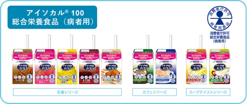 「アイソカル® 100」の既存シリーズは、消費者庁より特別用途食品のうち、「総合栄養食品」の表示許可を取得した栄養補給に適した総合栄養食品です。全9フレーバーは、フルーツ風味やコーヒー味などドリンクとして楽しめるテイストだけでなく、コーンスープ味など食事の一品にもなるスープテイストも取り揃えました。
