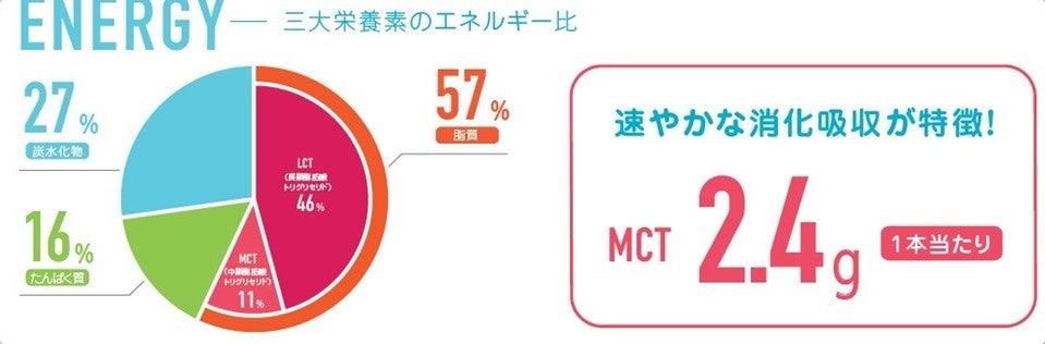 たんぱく質は、牛乳や豆乳と比べて約2倍※3を摂取できます。エネルギー効率の良いMCT(中鎖脂肪酸油)を2.4g配合しており、使いやすいようエネルギー効率も考慮しました。