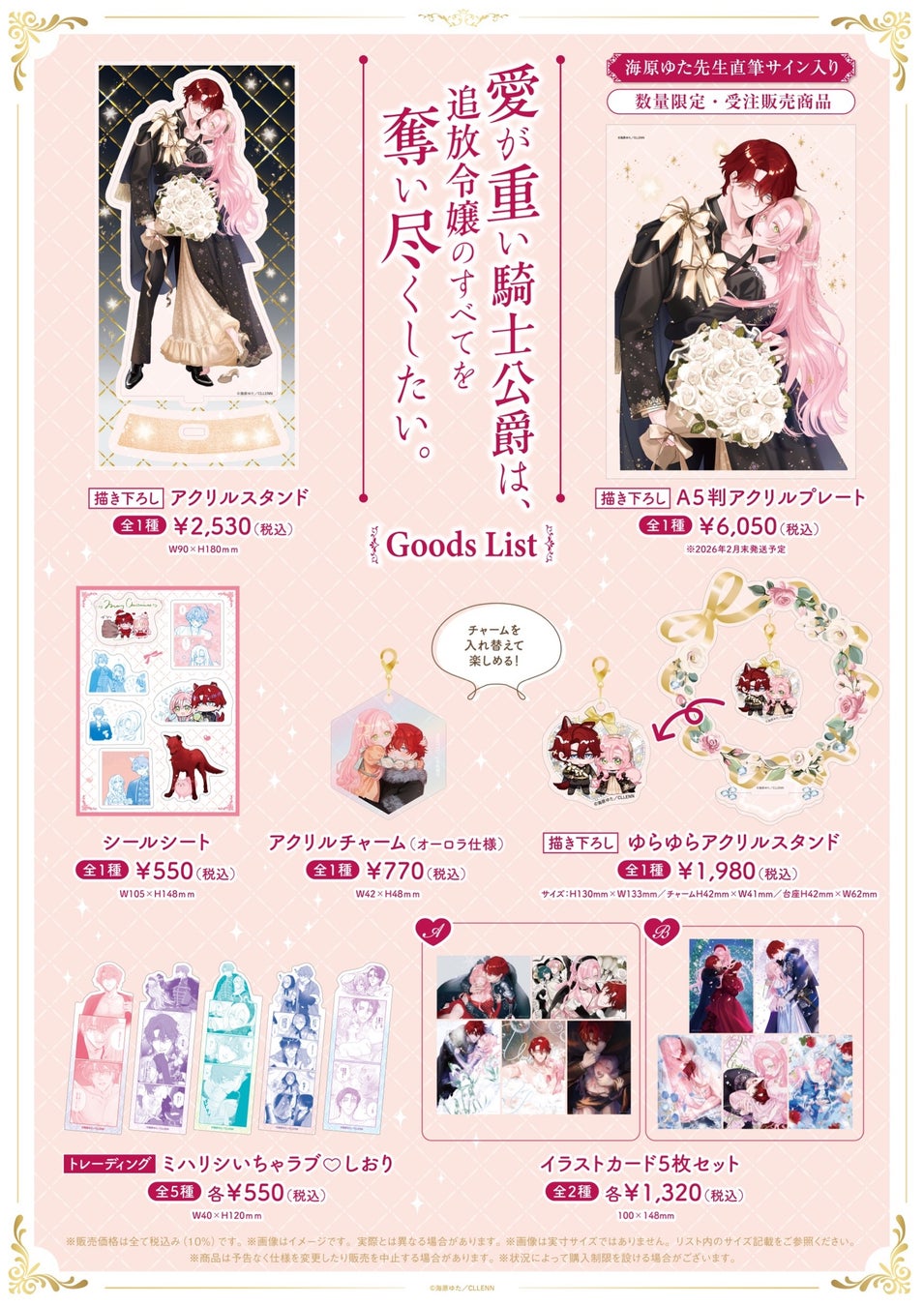 DMMグループのデジタルコミック出版社の株式会社CLLENN(本社:東京都港区、代表取締役:布川敦司、以下「CLLENN」、読み「シレン」)は、Renta!マンガ大賞2024 TL部門大賞を受賞、このTLにキュン♡2025 TL漫画部門1位受賞、電子累計800万DLを突破した、海原ゆた著『愛が重い騎士公爵は、追放令嬢のすべてを奪い尽くしたい。』の単行本4巻発売を記念して、本日11月21日(金)から12月14日(日)の期間中マンガ展 渋谷(MAGNET by SHIBUYA109内)にて複製原画の展示、オリジナルグッズ販売などを行う発売記念フェアを開催いたします。