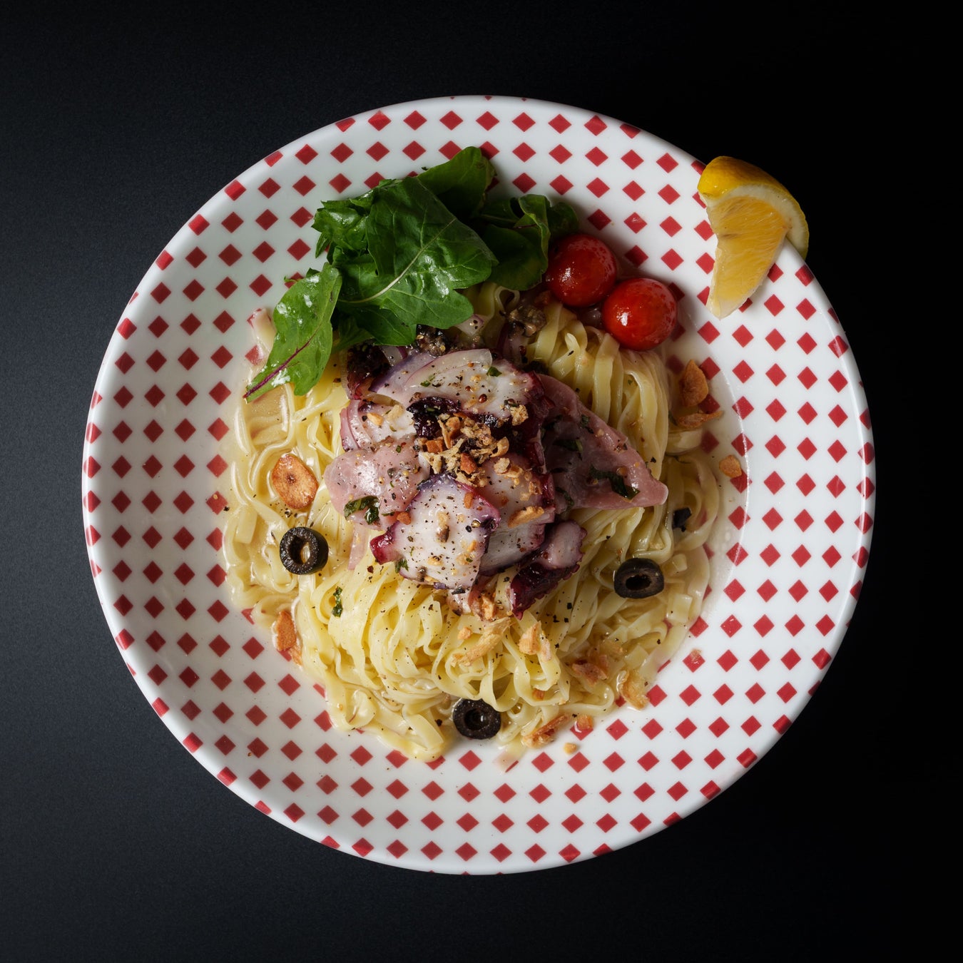 トマト、タコ、生ハムを色鮮やかにトッピングし、冷たい貝出汁スープに、マリネの酸味と香ばしいガーリックが重なります。