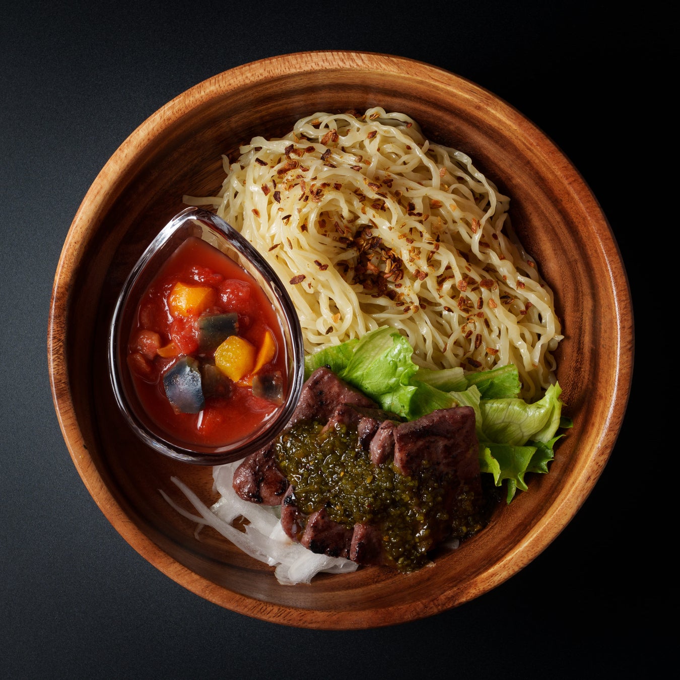 現地で親しまれるチミチュリソースで味付けした牛ハラミに、爽やかなサルサソースを合わせた新感覚のまぜそば。