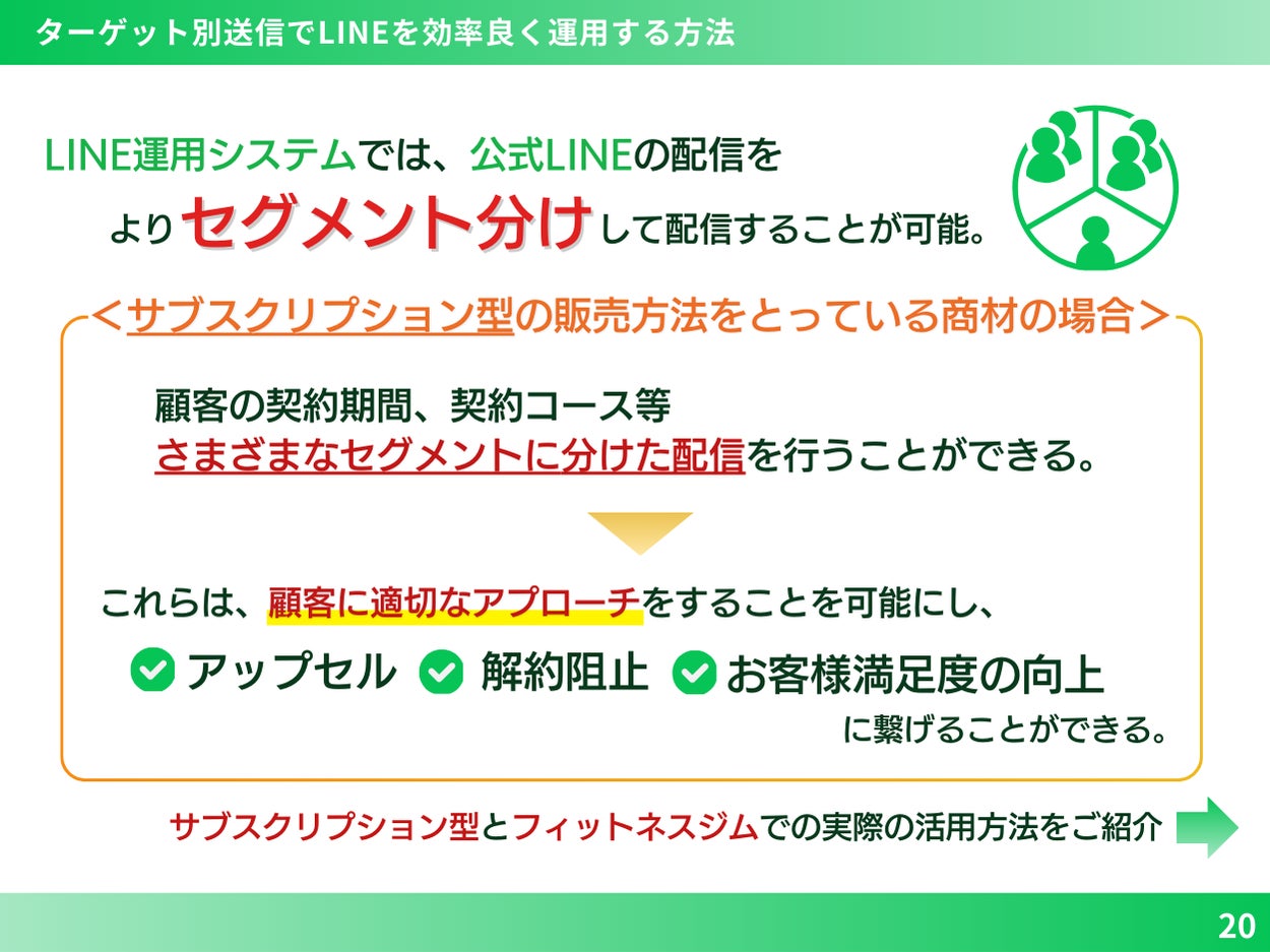 また、LINE運用システムでは、より詳細にセグメント分けした公式LINEからのメッセージ配信が可能です。例えば、サブスクリプション型商材の場合、顧客の契約期間、契約コース等さまざまなセグメントに分けた配信を定常送信することもできます。これらは、顧客毎の適切なアプローチを可能にし、アップセルや解約阻止、お客様満足度の向上に寄与します。
