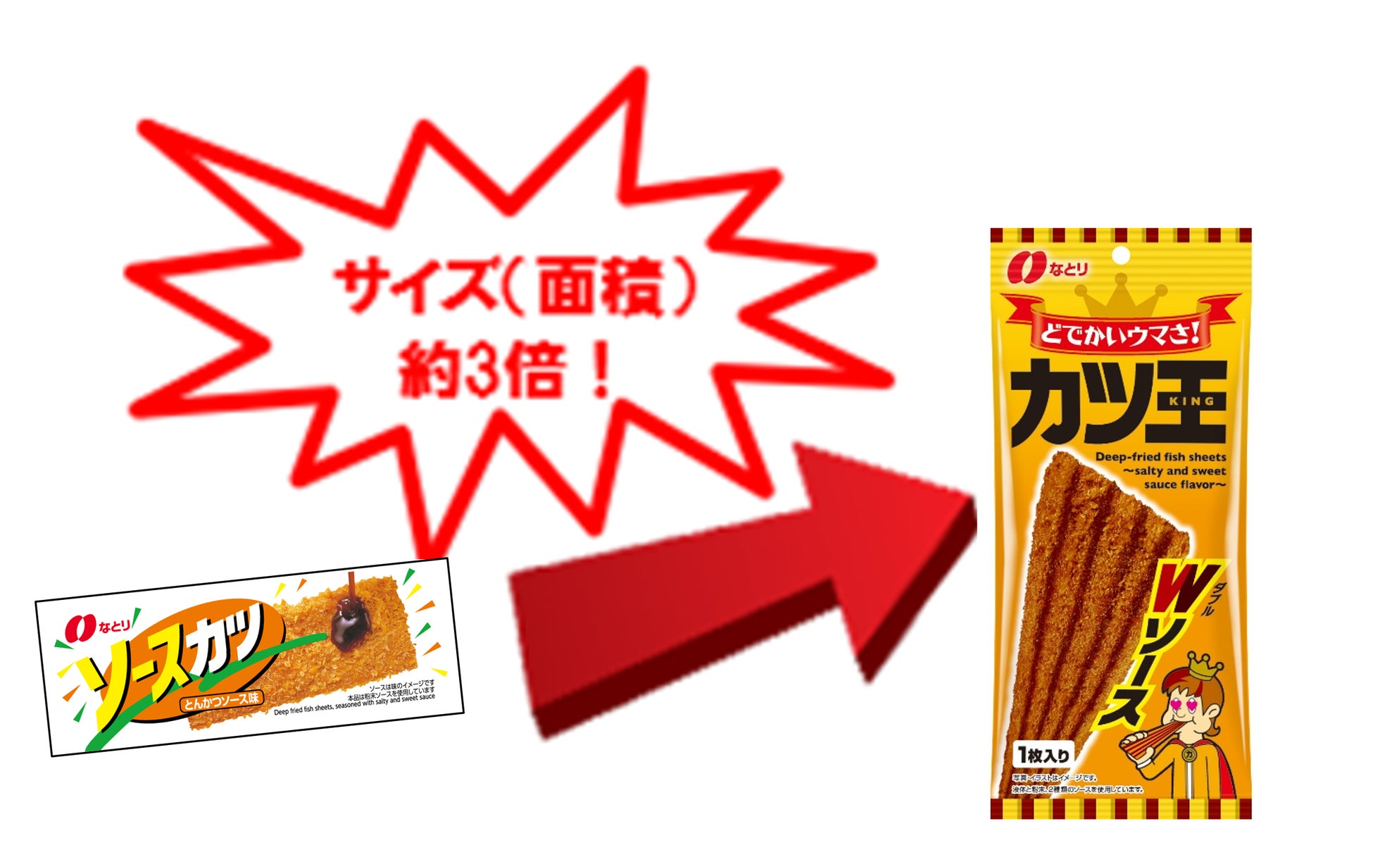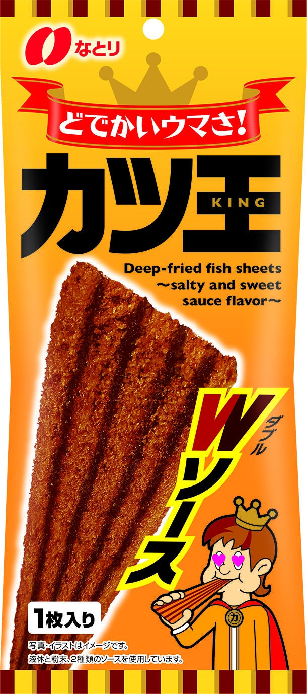 このような背景を受け、駄菓子として発売中の当社かつ製品「ソースカツ」※1よりもはるかに大きいサイズ感を実現した「カツ王Wソース」「カツ王ホットチリ風味(期間限定)」を発売します。