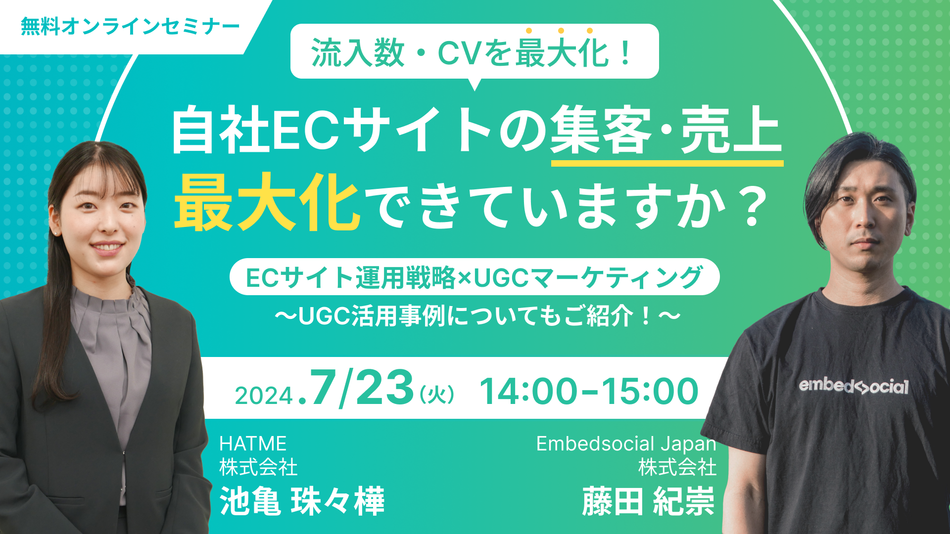 マーケティングアソシエーション株式会社の子会社であるHATME株式会社(本社:東京都台東区 代表取締役:中園広和、以下当社)は2024年7月23日(火)に、ウェブセミナー「【流入数・CVを最大化!】ECサイト運用戦略×UGCマーケティング ~UGC活用事例についてもご紹介!~」を、Embedsocial Japan株式会社と共催いたします。