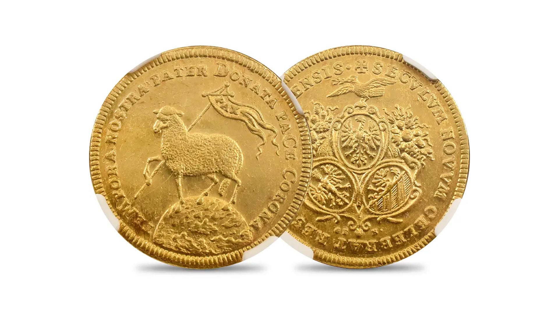 そして第3のコインは、これもまた1700年に発行されたとされる神の子羊が描かれている2ダカット金貨です。こちらは通常の丸型コインですが、より繊細な描き方がコインマニア向きであり、丸型コインをお望みの方にはお勧め品です。羊毛の柔らかさまでもが忠実に再現されており、コインコレクターの心に安らぎを与えることでしょう。