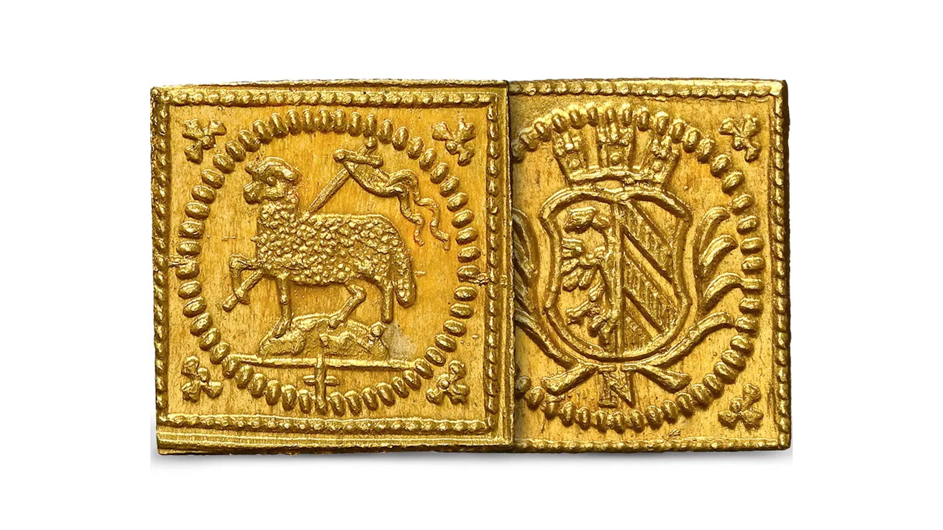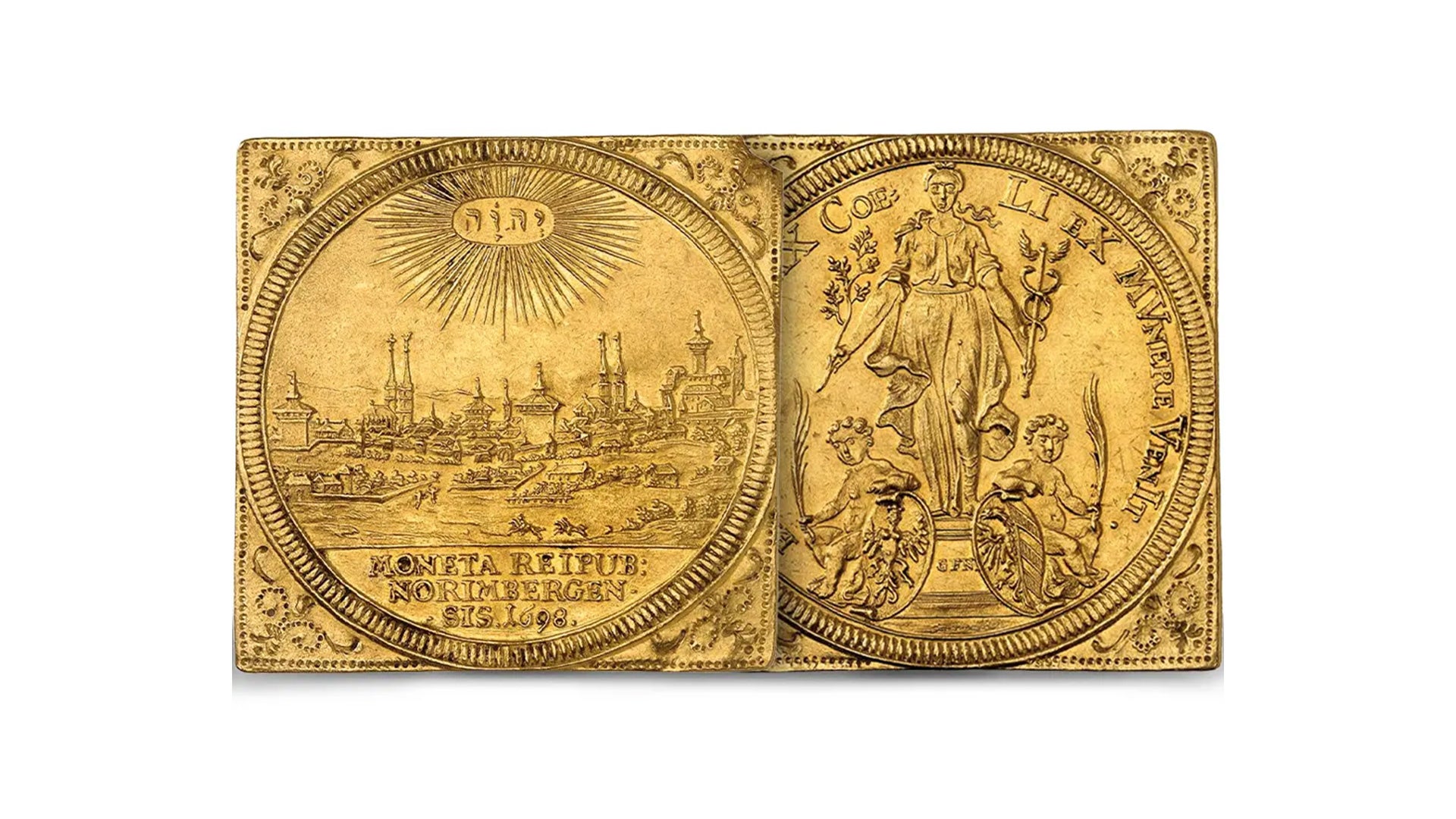 まず最初にご紹介させていただきたいのは、1698年に発行されました6ダカット・クリッペ(四角型)金貨です。正方形という形状も驚異的ではありますが、それにも増して驚嘆に値するのはコイン表面に描かれているドイツの都市ニュルンベルクの美しい景観です。中世以降ドイツ中部の商業都市として繁栄を極めたニュルンベルクの往時の古雅な街並みを堪能することのできる当コインは、街の歴史的な威厳と共にドイツ人の心の故郷である同都市を金属上に描き出す第一級の芸術作品でもあります。