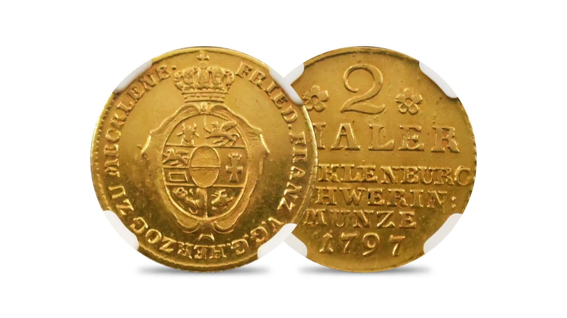 そして最後のコインは、少し後の時代の1797年にドイツのメクレンブルク=シュヴェリーンで発行されたこれもまた丸形の2ターラー金貨です。