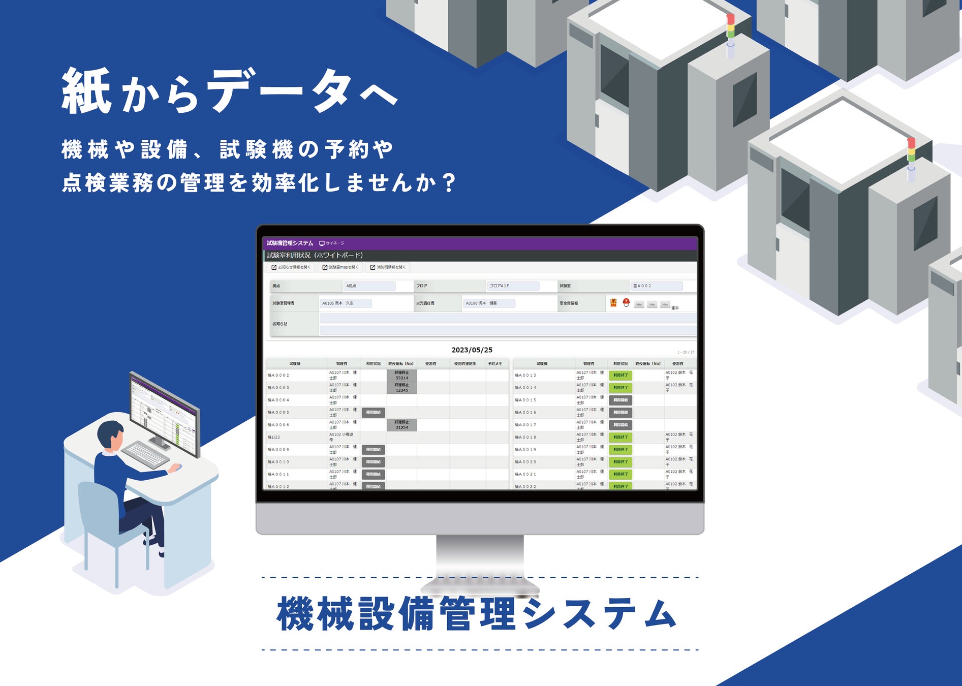 製造業における機械設備の一元管理と業務効率化を実現するソリューションです。本システムは、設備の予約、点検、利用状況モニタリング、電子棚札連携を通じて、管理情報の電子化と共有を支援します。特に、複数部門で使用される試験機や製造機器の管理において、予約や点検データの一元化、設備情報のリアルタイム更新が可能です。