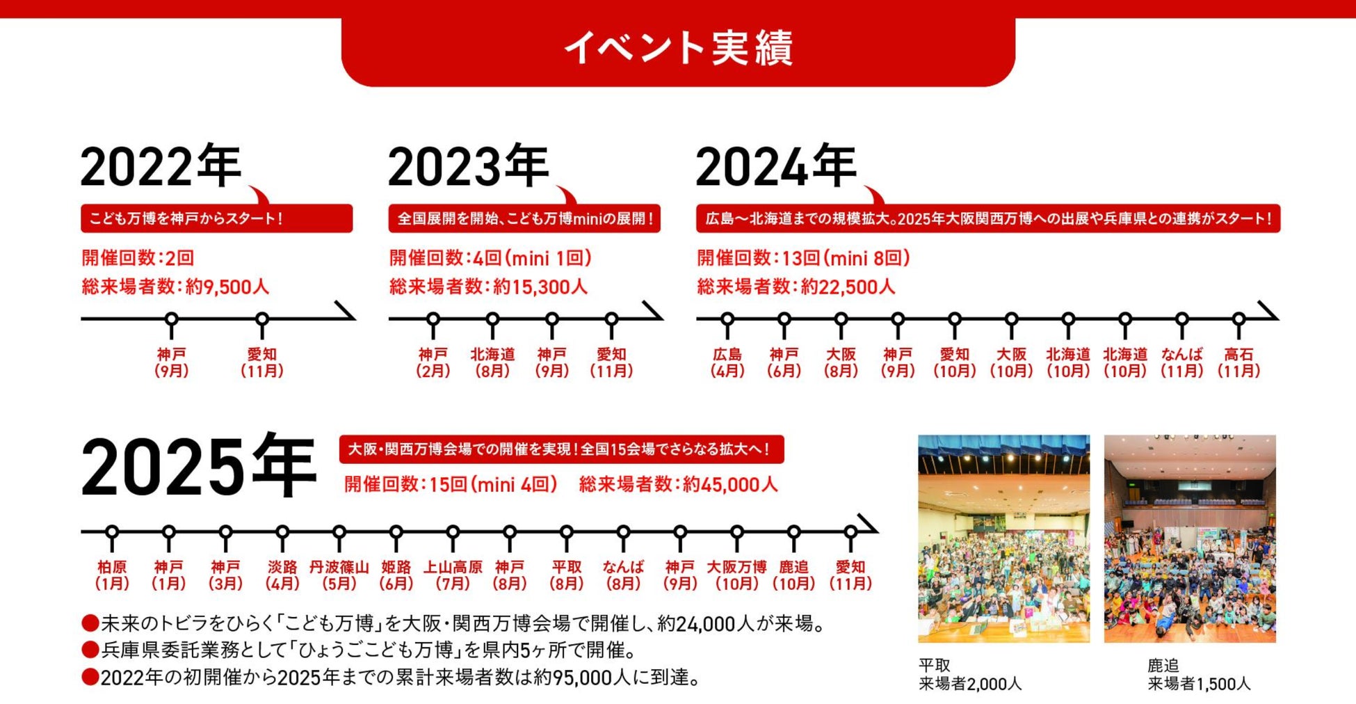 「こども万博」は2022年9月の初開催以来、3年半で累計約9.5万人を動員。子どもたち自身が自分の夢や可能性を発見し、その成長を家族で実感することを目的としたイベントとして、全国各地で開催されています。夢スピーチコンテスト、おしごと体験、こども縁日など多彩なプログラムを通じて、子どもたちが自分の未来と出会い、"今"を輝かせるきっかけを届けてきました。2025年には大阪・関西万博でも開催し、2日間で約2.4万人が来場。 2026年は国内8都市に加え、マレーシア・フランスでの初の海外展開を予定しています。