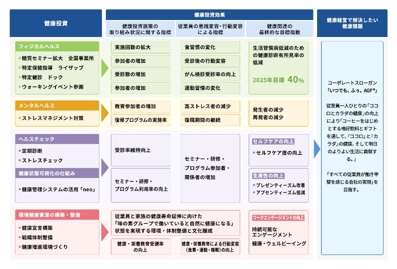 味の素AGFは、従業員が健康でいきいきと働ける職場づくりに取り組むことで、その人の持つ能力を十分に発揮し、お客様の「ココロ」と「カラダ」の健康、そして明日のよりよい生活に貢献できると考え、従業員の心身の健康を維持・増進する取り組みや勤務環境の整備、働き方改革を積極的に進めてきました。