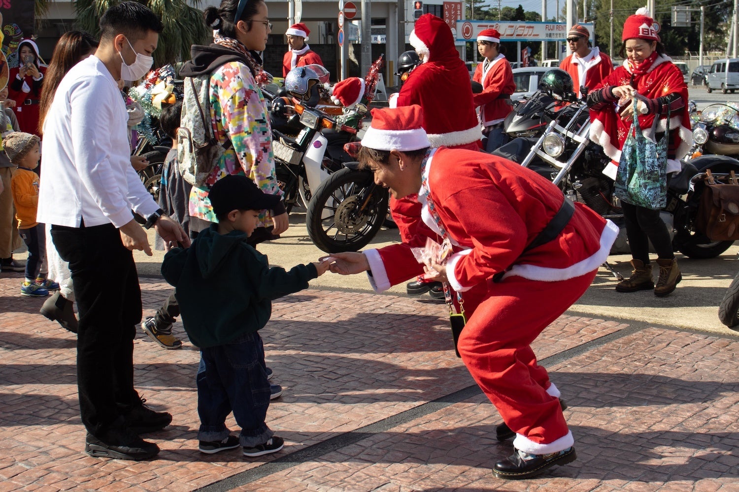 地元のキッチンカーが多く出店し、タコスやスペアリブ、沖縄そばの麺をアレンジしたパスタなど、沖縄ならではのグルメも提供され、来場者の舌を楽しませました。さらに、サンタクロース姿のライダーがバイクで登場し、子どもたちにお菓子を配る演出もあり、歓声と笑顔があふれるひとときに。