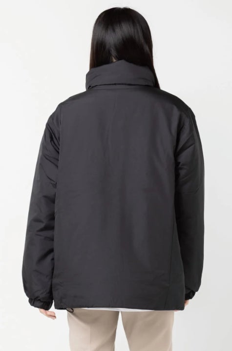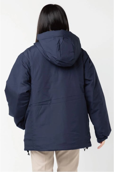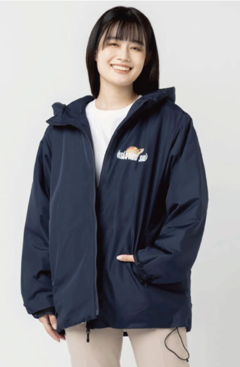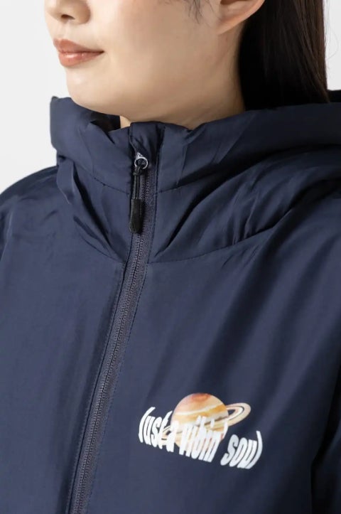 フード付きでしっかり暖かい中綿ブルゾン。軽量で程よい光沢のある生地を使用しており、プリントや刺繍が美しく映える仕様です。フロントはダブルジップ仕様で、上まで閉めるとハイネックとして着用可能。袖口と裾は防寒調整ができ、寒い季節でも快適な着心地を実現します。