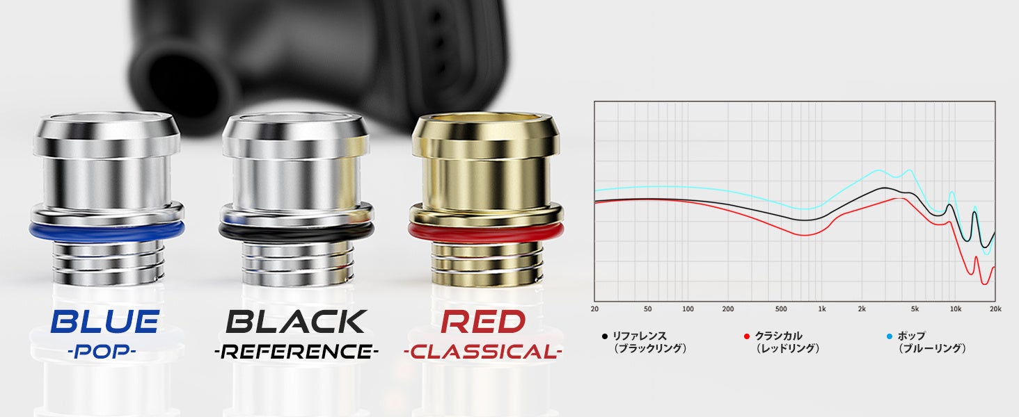 それぞれ、リファレンス(ブラック)、クラシカル(レッド)、ポップ(ブルー)の異なるフィルターデザイン形状を有し、3種のフィルターでカスタマイズすることで、お好みのサウンドスタイルを楽しむことができます。