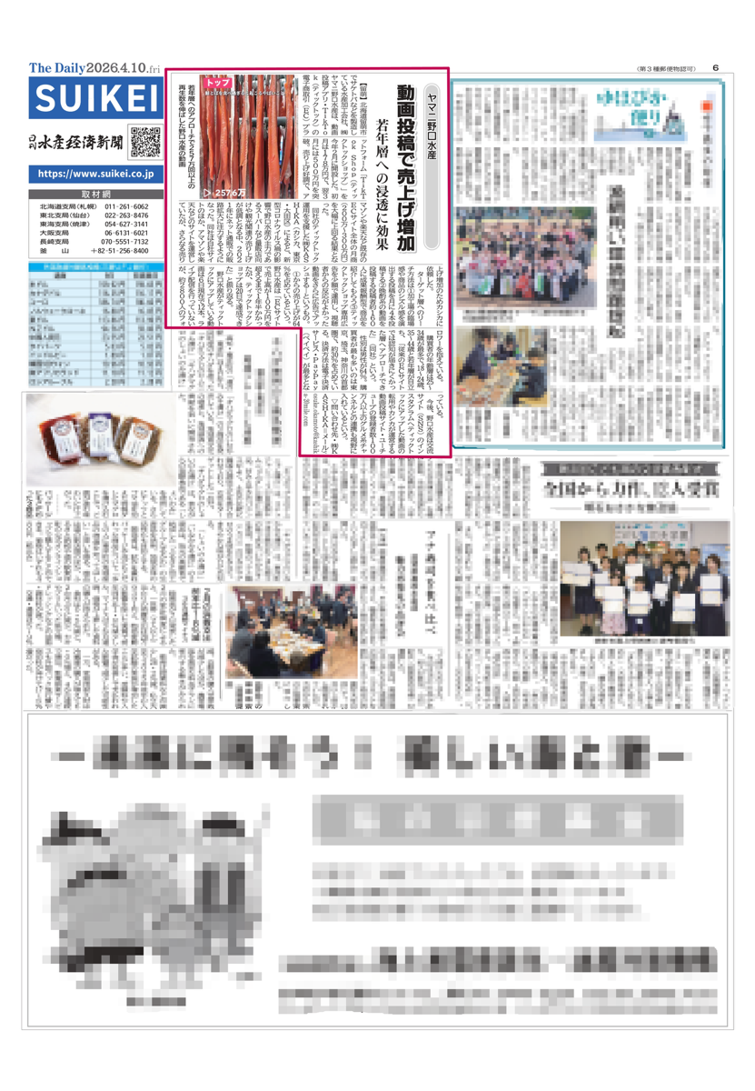 株式会社KASHIKA(本社:東京都大田区、代表取締役:小澤健太)は、同社が運営するSNS運用支援ツール「2nd Buzz」( https://2nd-buzz.com/sns-solution/ )でTikTok運用を支援している株式会社ヤマニ野口水産(北海道留萌市)の事例が、2026年4月10日付の水産経済新聞に掲載されたことをお知らせいたします。