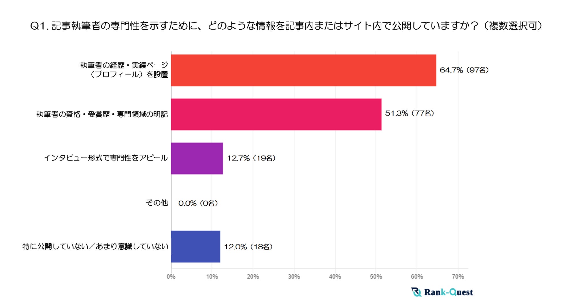 最も多かった回答は「執筆者の経歴・実績ページ(プロフィール)の設置」で、全体の64.7%(97名)が記事やサイト内でこれを公開しているという結果でした。次いで、「執筆者の資格・受賞歴・専門領域の明記」も半数以上の51.3%(77名)に上り、執筆者自身の実績や専門性を積極的に見せているサイトが多いことがわかります。
