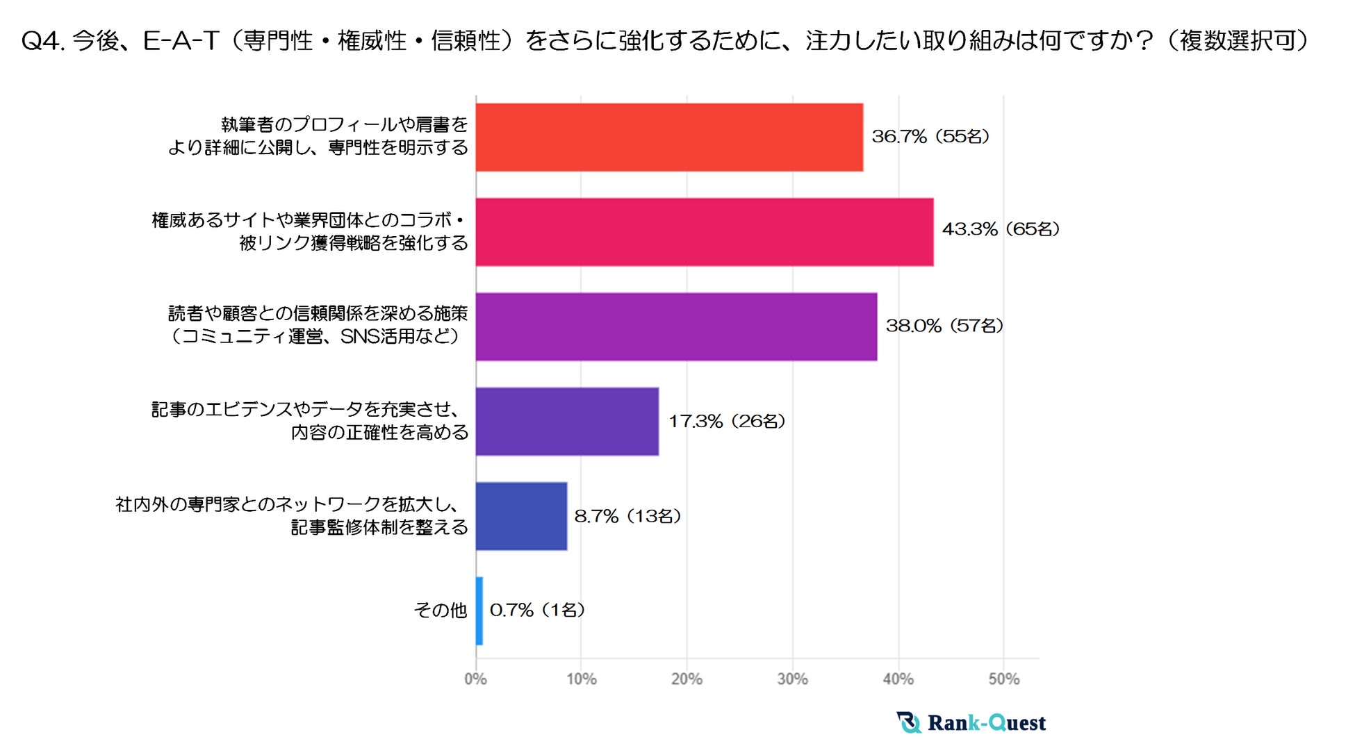 最も多かった回答は「権威あるサイトや業界団体とのコラボ・被リンク獲得戦略を強化する」で、全体の43.3%(65名)が選択しました。これは「調査結果➁」でも見られたように、オーソリティサイトとの連携や外部からの被リンク獲得がE-A-T向上に直結すると考えるサイトが多いことを示唆しています。