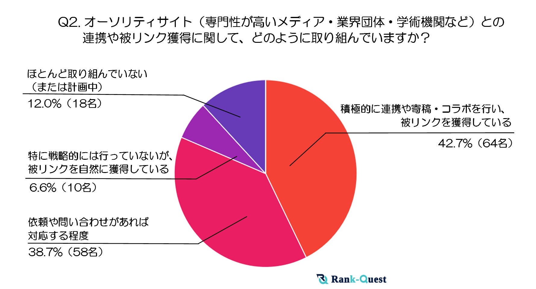 最も多かった回答は「積極的に連携や寄稿・コラボを行い、被リンクを獲得している」で、42.7%(64名)を占めています。これは専門性の高いメディアや業界団体、学術機関などと積極的に関係を築き、被リンク獲得につなげる動きが一定の支持を得ていることを示しています。