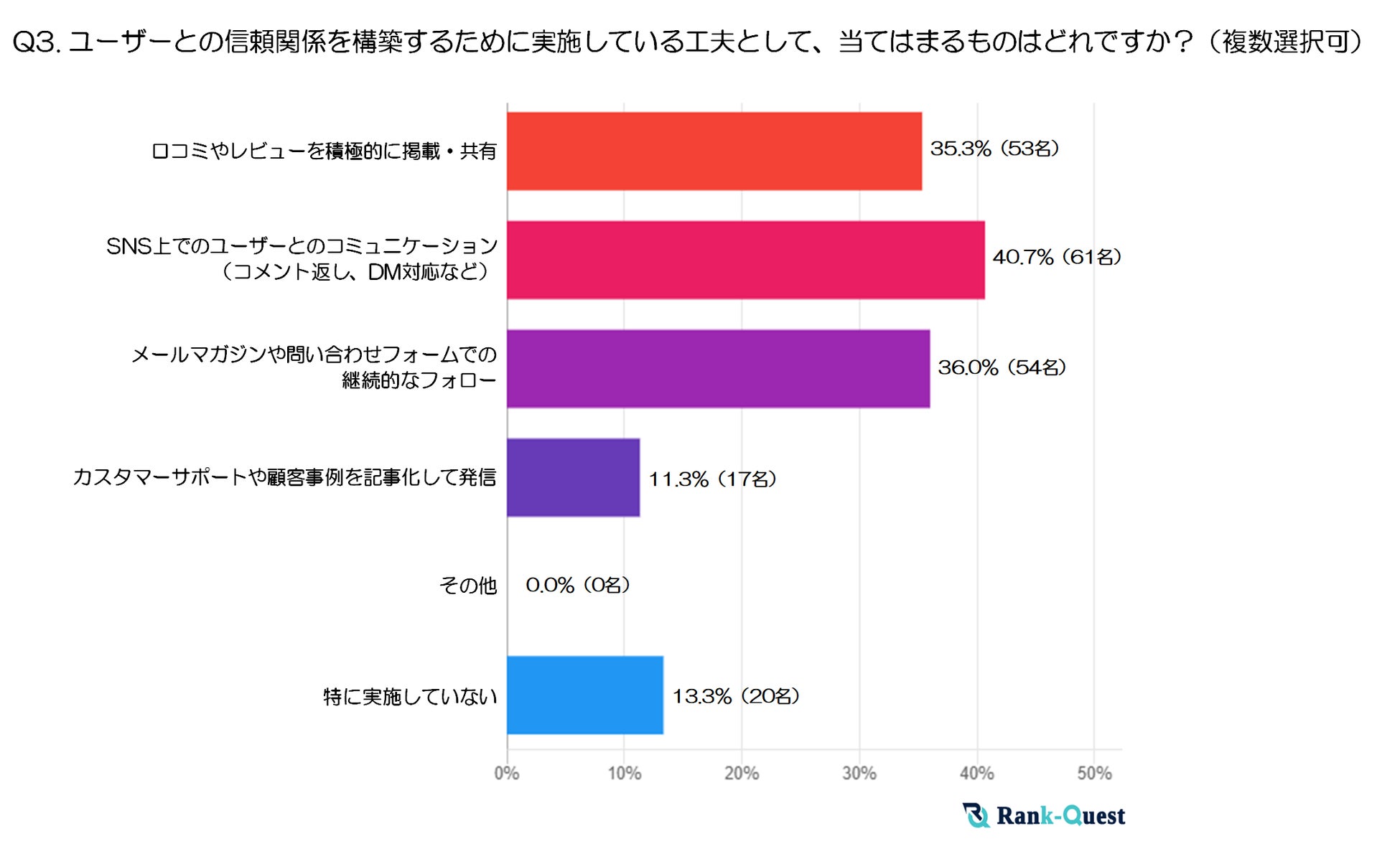 次いで「メールマガジンや問い合わせフォームでの継続的なフォロー」が36%(54名)、「口コミやレビューを積極的に掲載・共有」が35.3%(53名)と、ユーザーの反応を取り入れたり継続的な情報発信を行ったりする手法も多く採用されています。