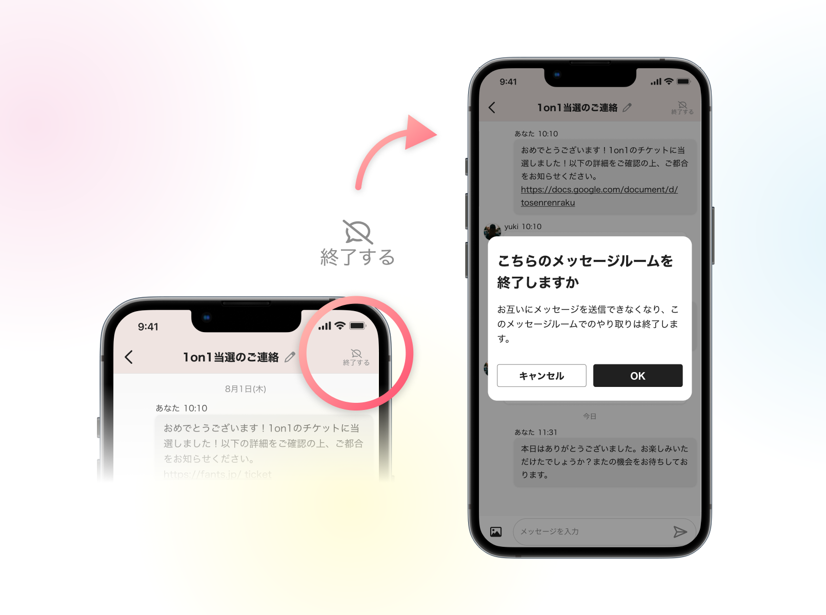 やり取りが完了した際、管理者側からメッセージのやり取りを終了させることができます。これにより、不要な返信の継続を防ぎ、運営者の工数管理を容易にします。(※3)