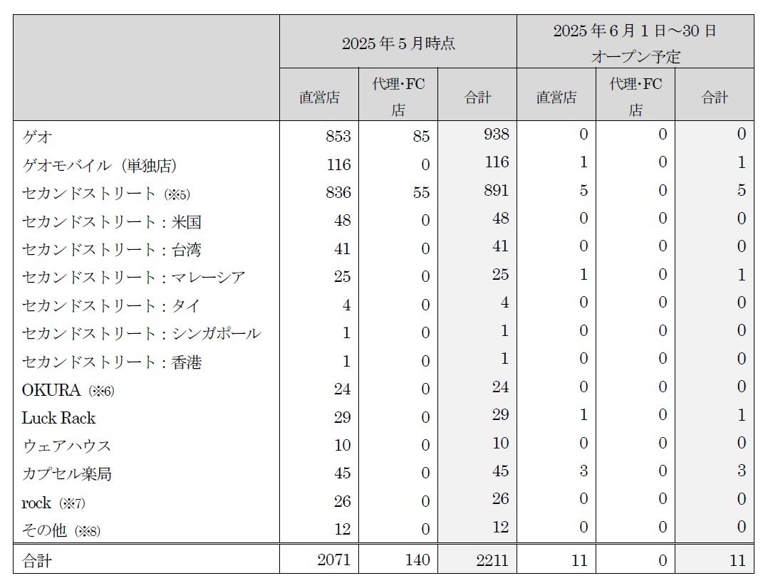 新たに、「セカンドストリート」6店舗、「ゲオモバイル」1店舗、「ラックラック」1店舗、「カプセル楽局」3店舗の合計11店舗が2025年6月度にオープンします。